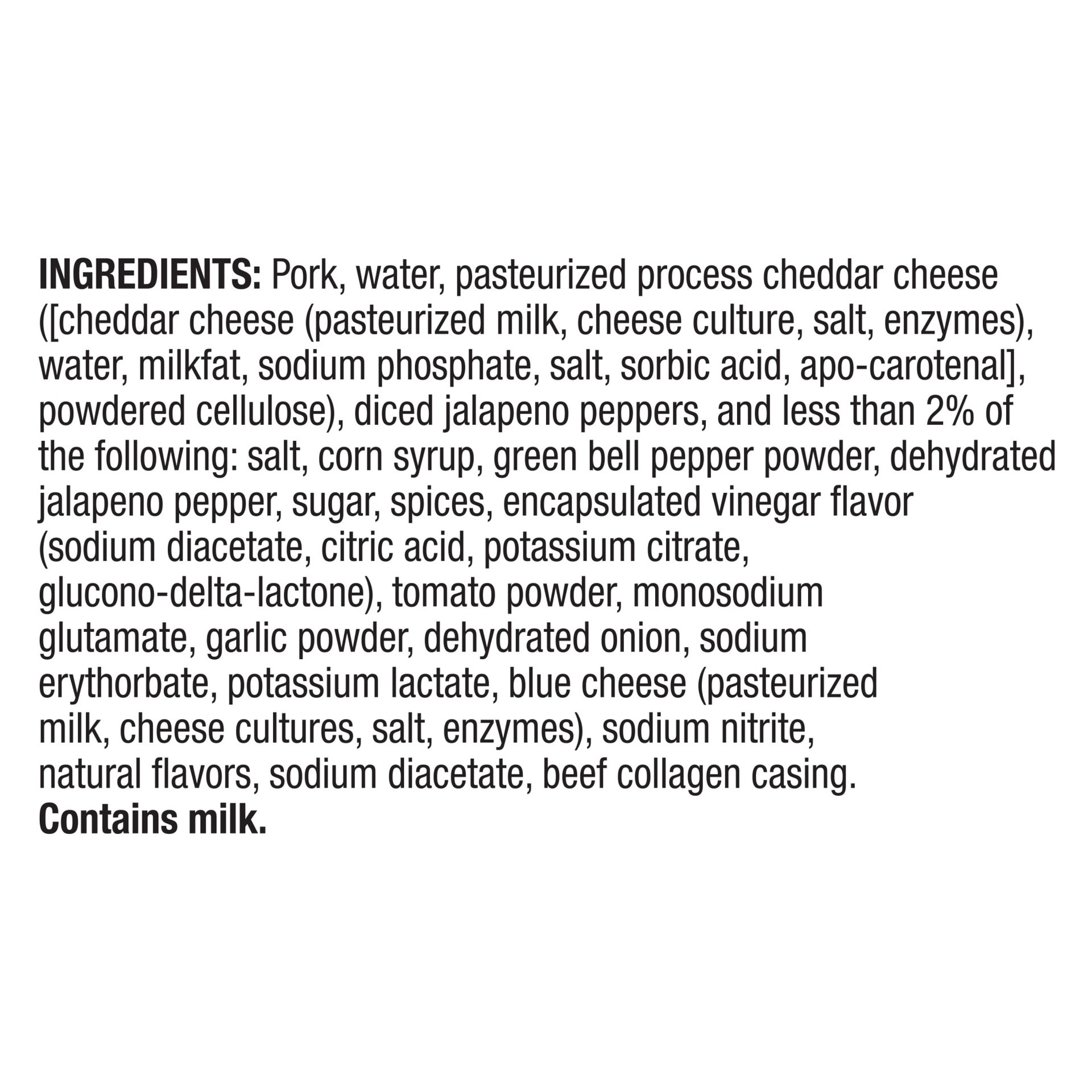 Pork, Water, Pasteurized Process Cheddar Cheese ([Cheddar Cheese (Pasteurized Milk, Cheese Culture, Salt, Enzymes), Water, Milkfat, Sodium Phosphate, Salt, Sorbic Acid, Apo-Carotenal], Powdered Cellul…