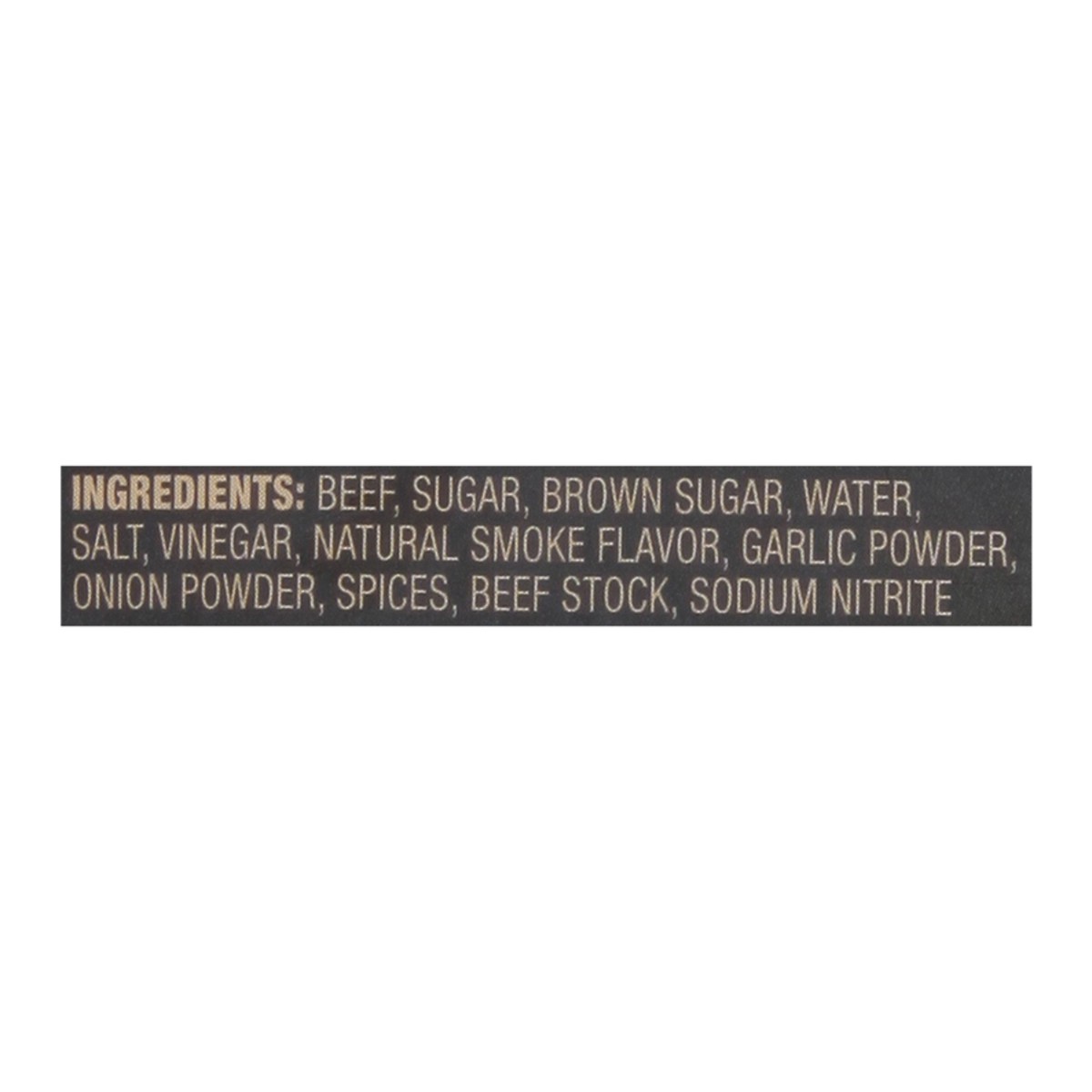 Beef, Sugar, Brown Sugar, Water, Salt, Vinegar, Natural Smoke Flavor, Garlic Powder, Onion Powder, Spices, Beef Stock, Sodium Nitrite.