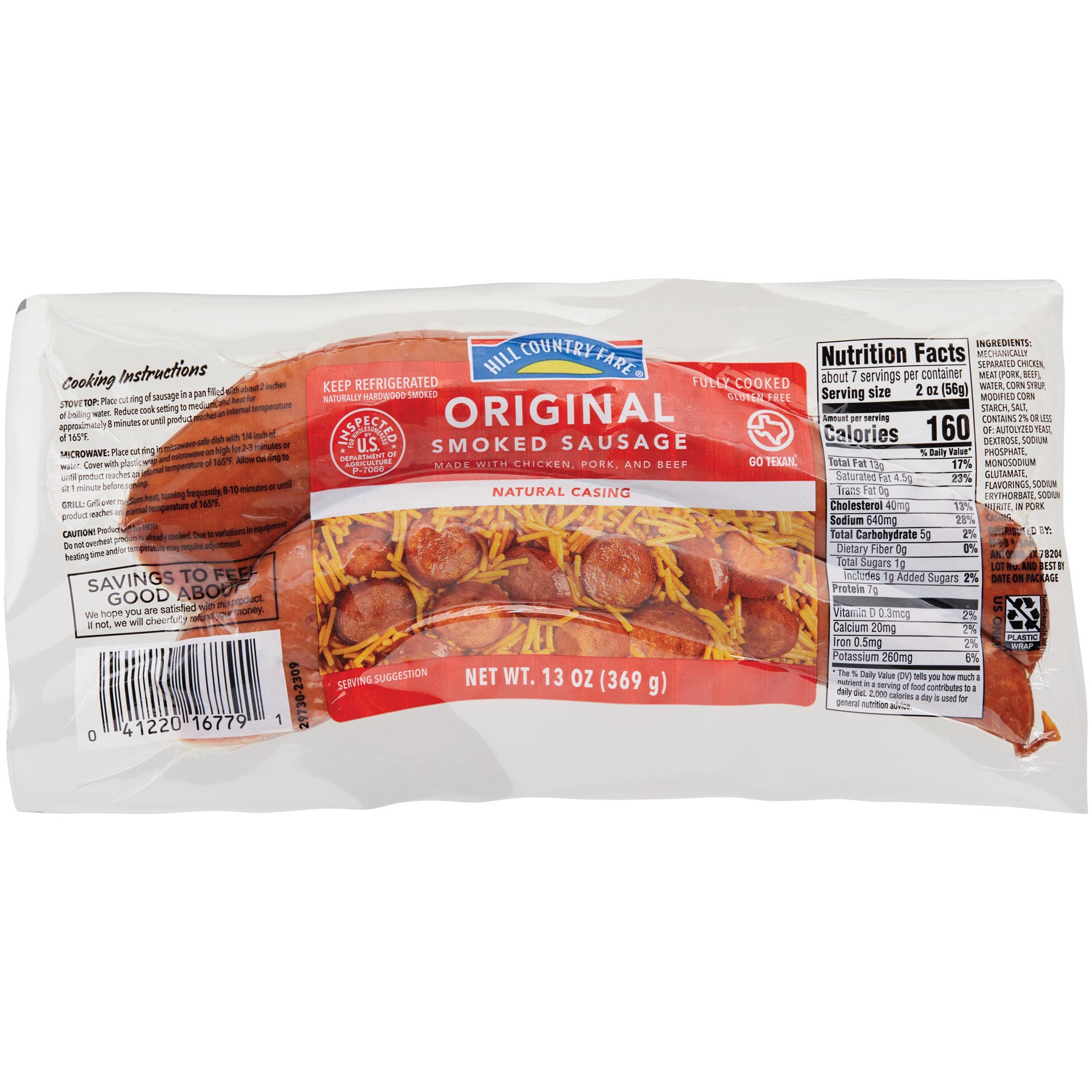 Naturally hardwood-smoked and fully cooked, Hill Country Fare original smoked sausage is made of chicken, pork and beef. Packed with juicy deliciousness, these links are easy to heat up on the grill, …