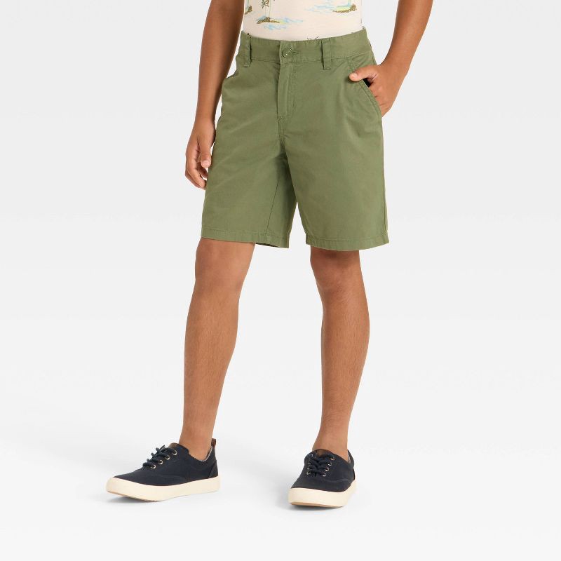 These Flat-Front At-the-Knee Chino Shorts from Cat & Jack™ are a great pick for school and beyond. Made from 100% cotton, these mid-rise jean shorts offer your child all-day cool comfort. An adjustabl…