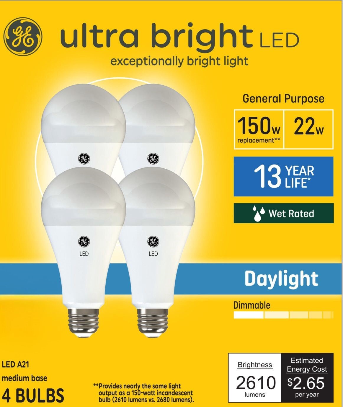 GE Ultra Bright 150 -Watt EQ A21 Daylight Medium screw base E26 Dimmable LED General purpose Light Bulb 4 -Pack