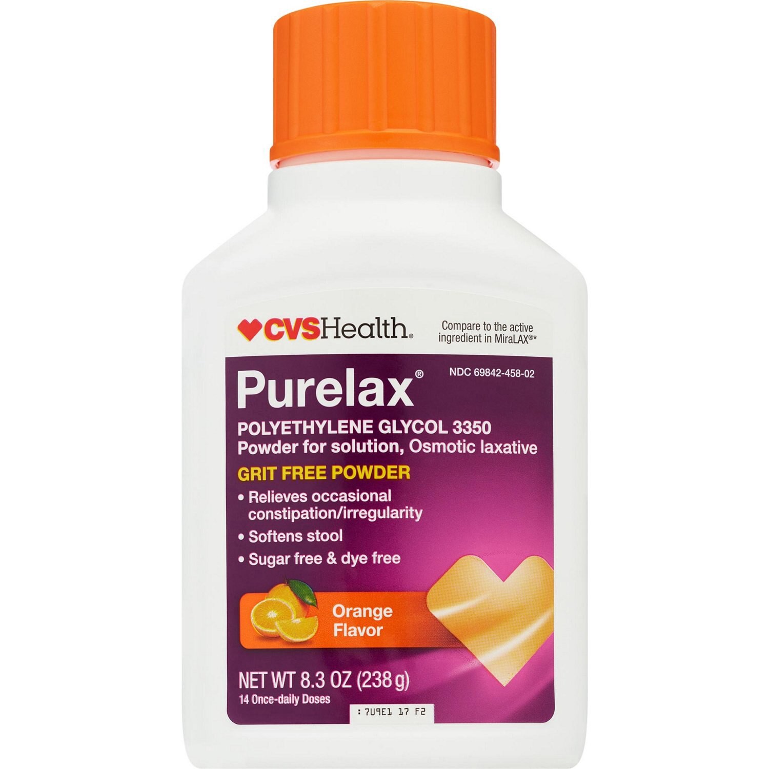 Compare to the active ingredient in MiraLAX. CVS Health Purelax Polyethylene Glycol 3350 Powder for Solution, Orange Flavor, is a laxative used to relieve occasional constipation (irregularity). An os…