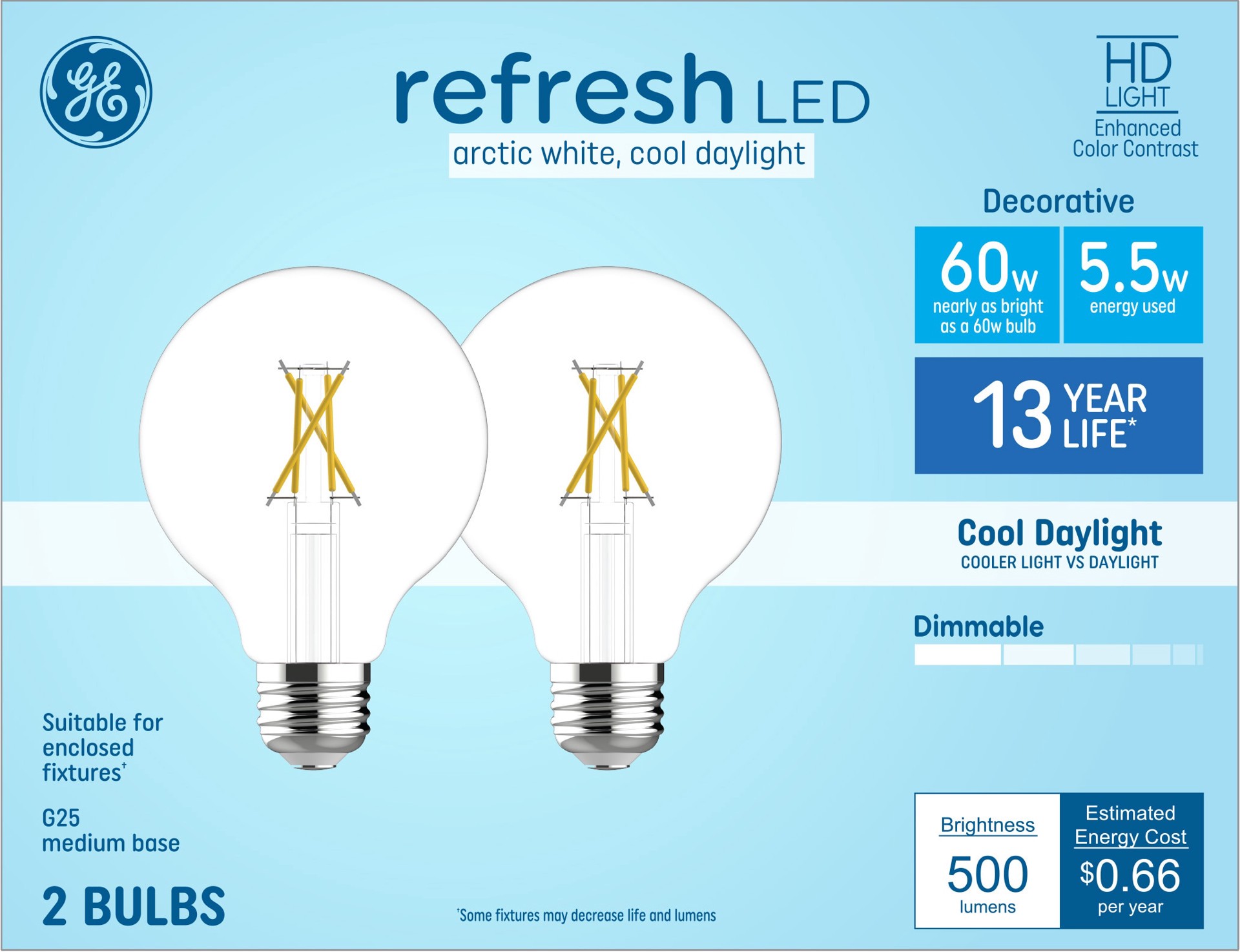 GE 60 -Watt EQ G25 Cool daylight Medium screw base E26 Dimmable LED Decorative Light Bulb 2 -Pack