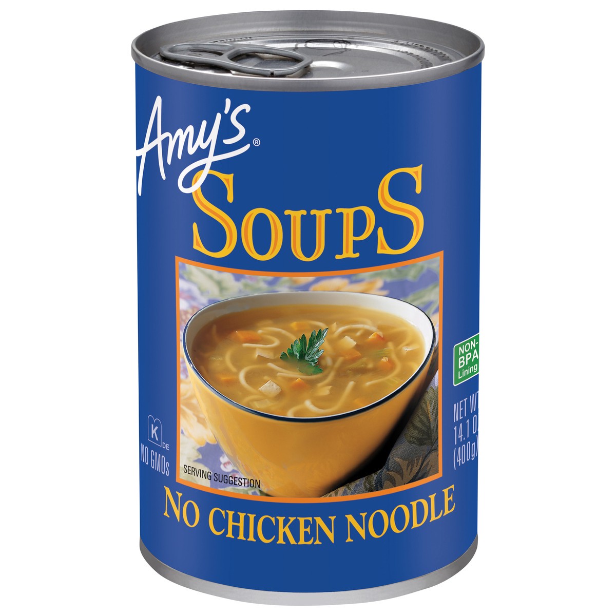 Ready to serve. Amy's No Chicken Noodle made with noodles and vegetables, is our version of grandma's soothing soup. It's tasty, comforting and, of course, contains no chicken. Amy's Kitchen was start…