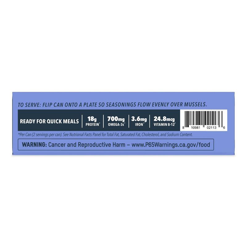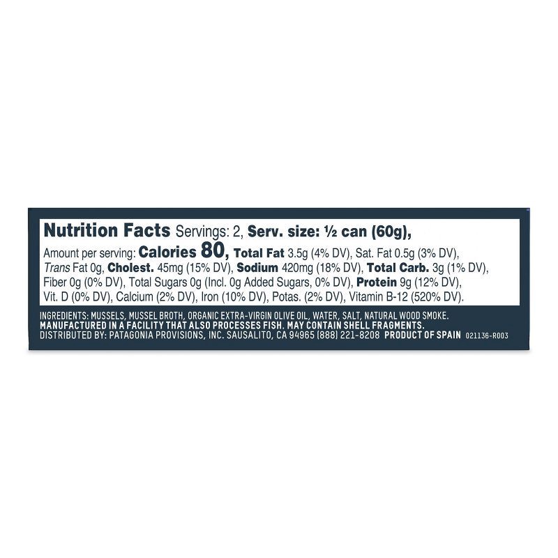 Mussels, Mussel Broth, Organic Extra-Virgin Olive Oil, Water, Salt, Natural Wood Smoke.