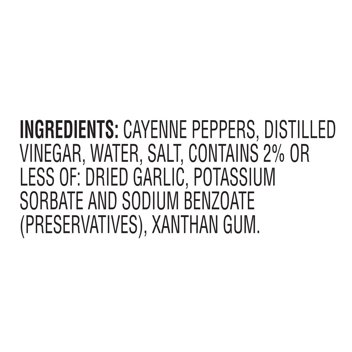 Cayenne Peppers, Distilled Vinegar, Water, Salt, Contains 2% or Less of: Dried Garlic, Potassium Sorbate and Sodium Benzoate (Preservatives), Xanthan Gum.