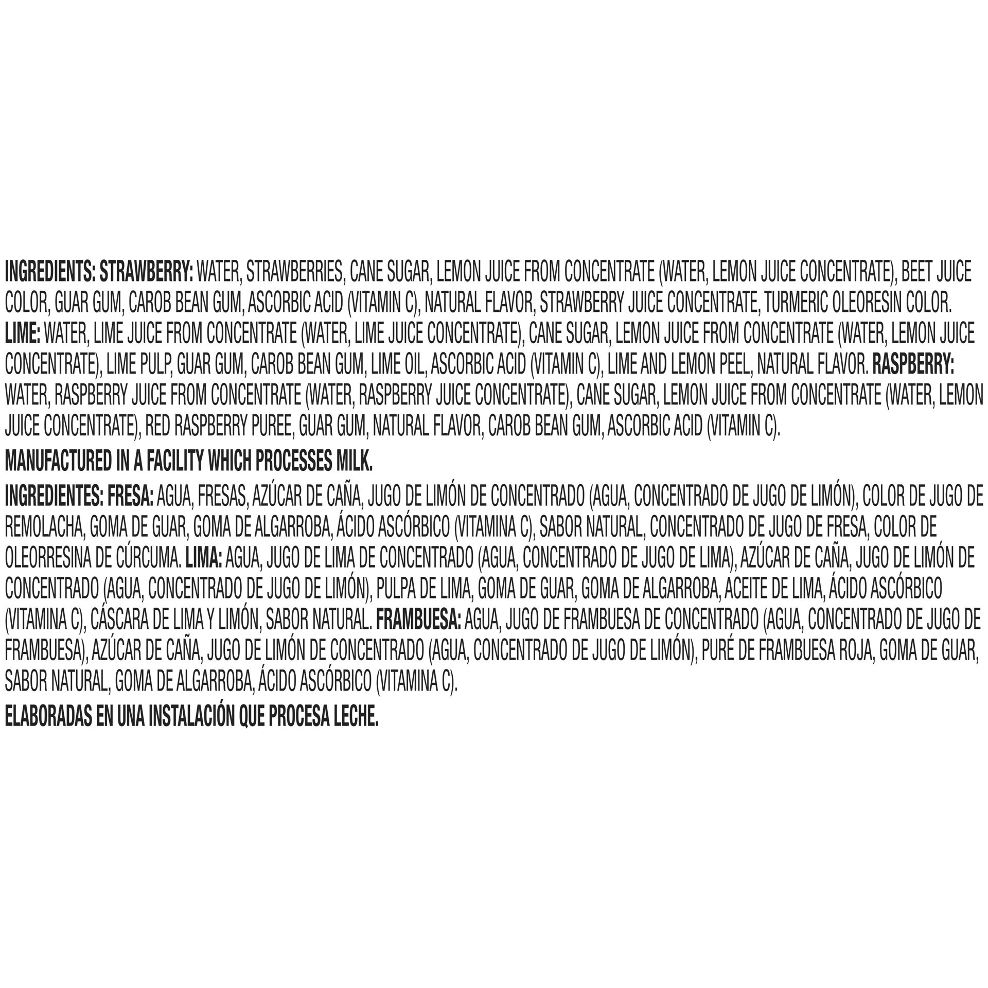 STRAWBERRY: WATER, STRAWBERRIES, CANE SUGAR, LEMON JUICE FROM CONCENTRATE (WATER, LEMON JUICE CONCENTRATE), BEET JUICE COLOR, GUAR GUM, CAROB BEAN GUM, ASCORBIC ACID (VITAMIN C), NATURAL FLAVOR, STRAW…
