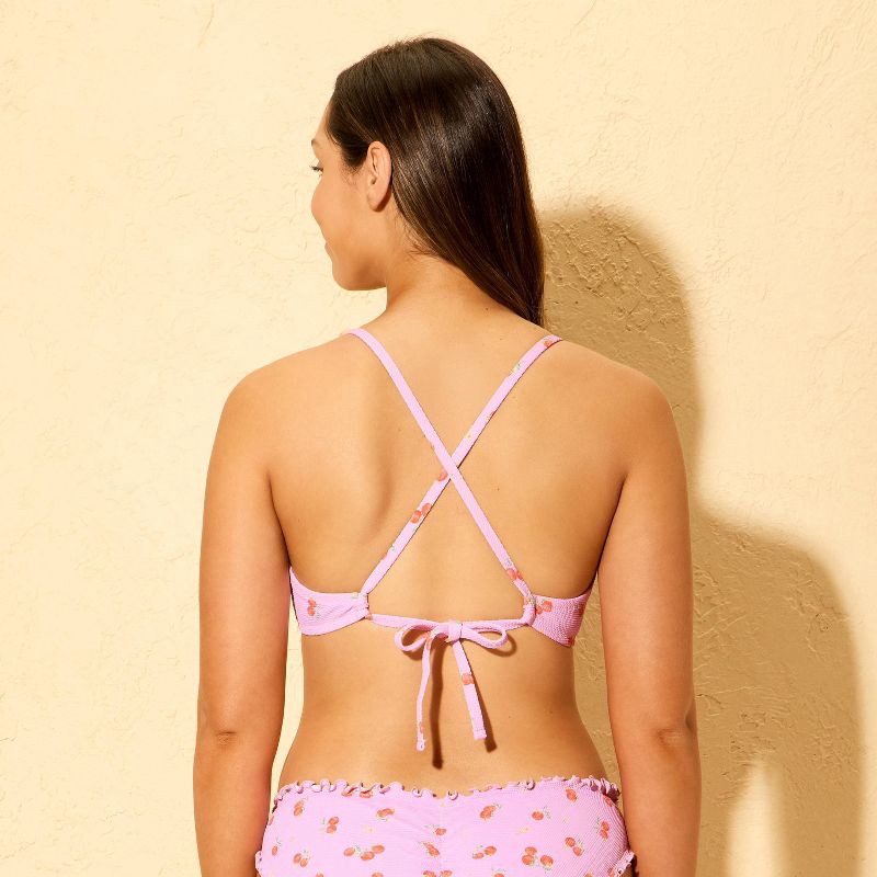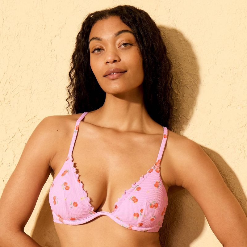 This Peach Print Ruffle Underwire Bikini Top from Shade & Shore™ brings summery style to your swimwear. This pique underwire bikini top is adorned with tiny prints of orange-and-green peaches and yell…