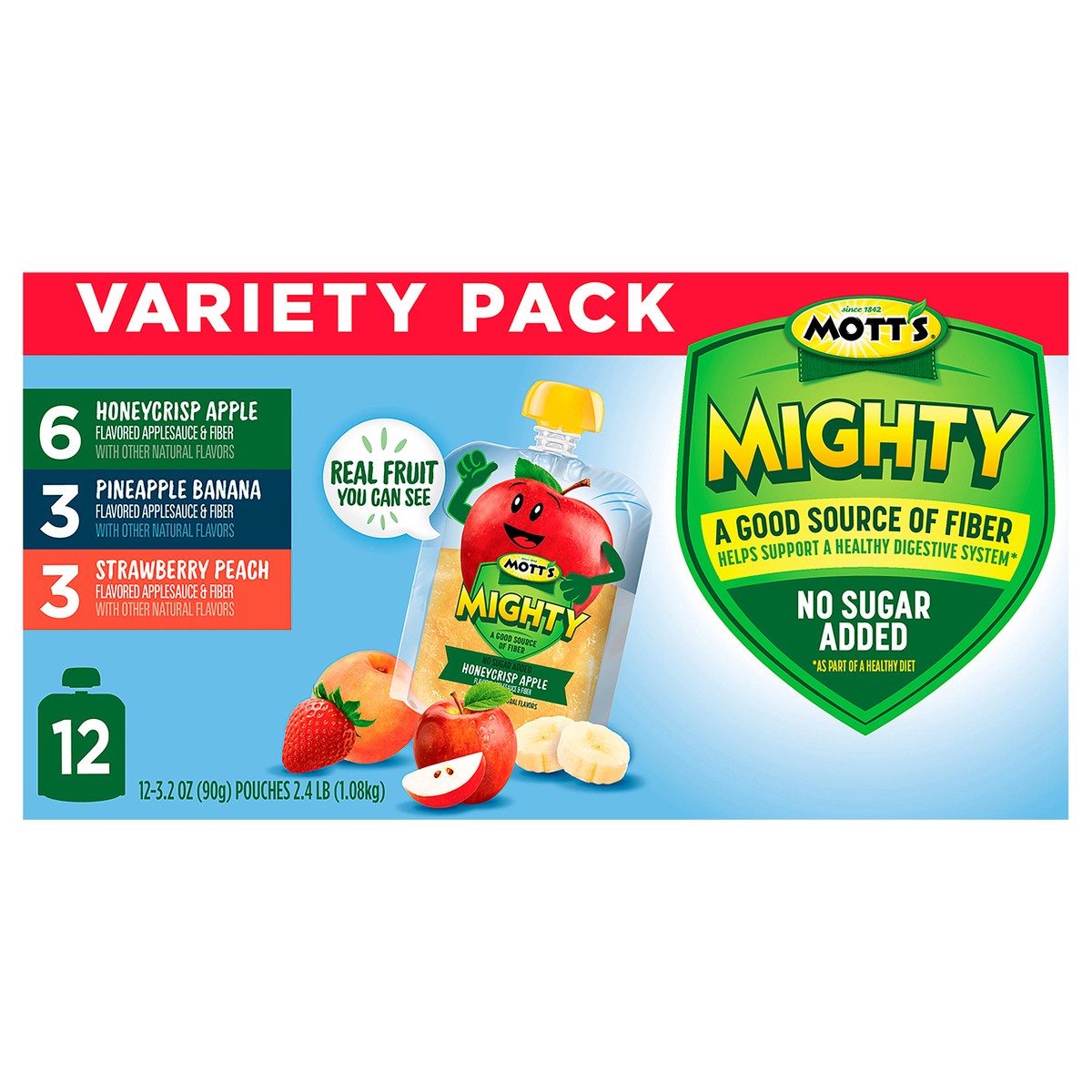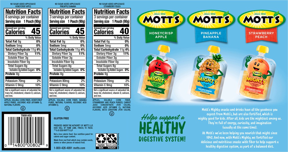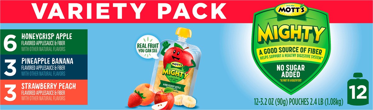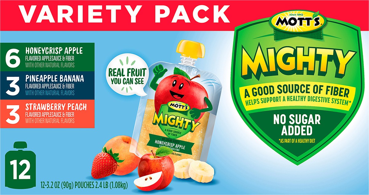 - GOOD FOR YOU: Mott’s Mighty Applesauce Variety Pack pouches have no sugar added and are a good source of fiber to help support a healthy digestive system.