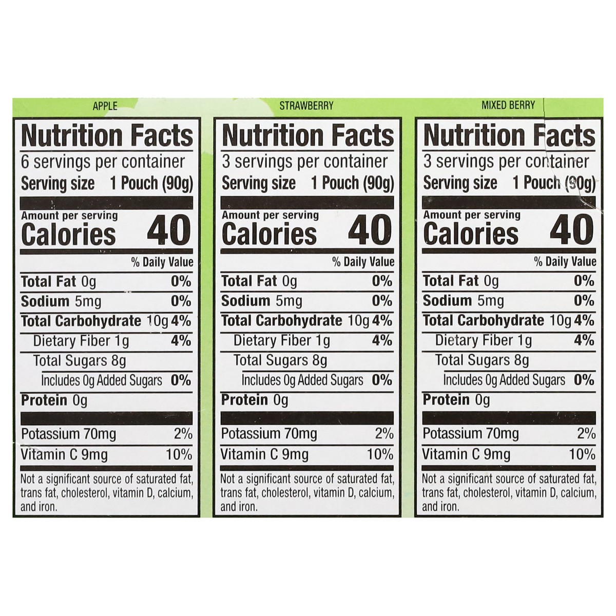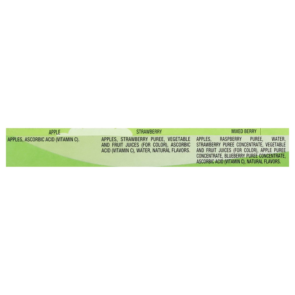 No Sugar Added Applesauce Apple: Apples, Ascorbic Acid (Vitamin C). No Sugar Added Applesauce Strawberry: Apples, Strawberry Puree, Vegetable and Fruit Juices (for Color), Ascorbic Acid (Vitamin C), W…