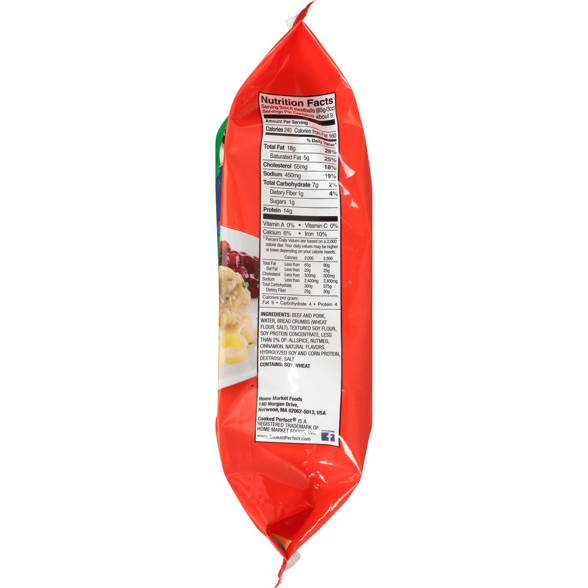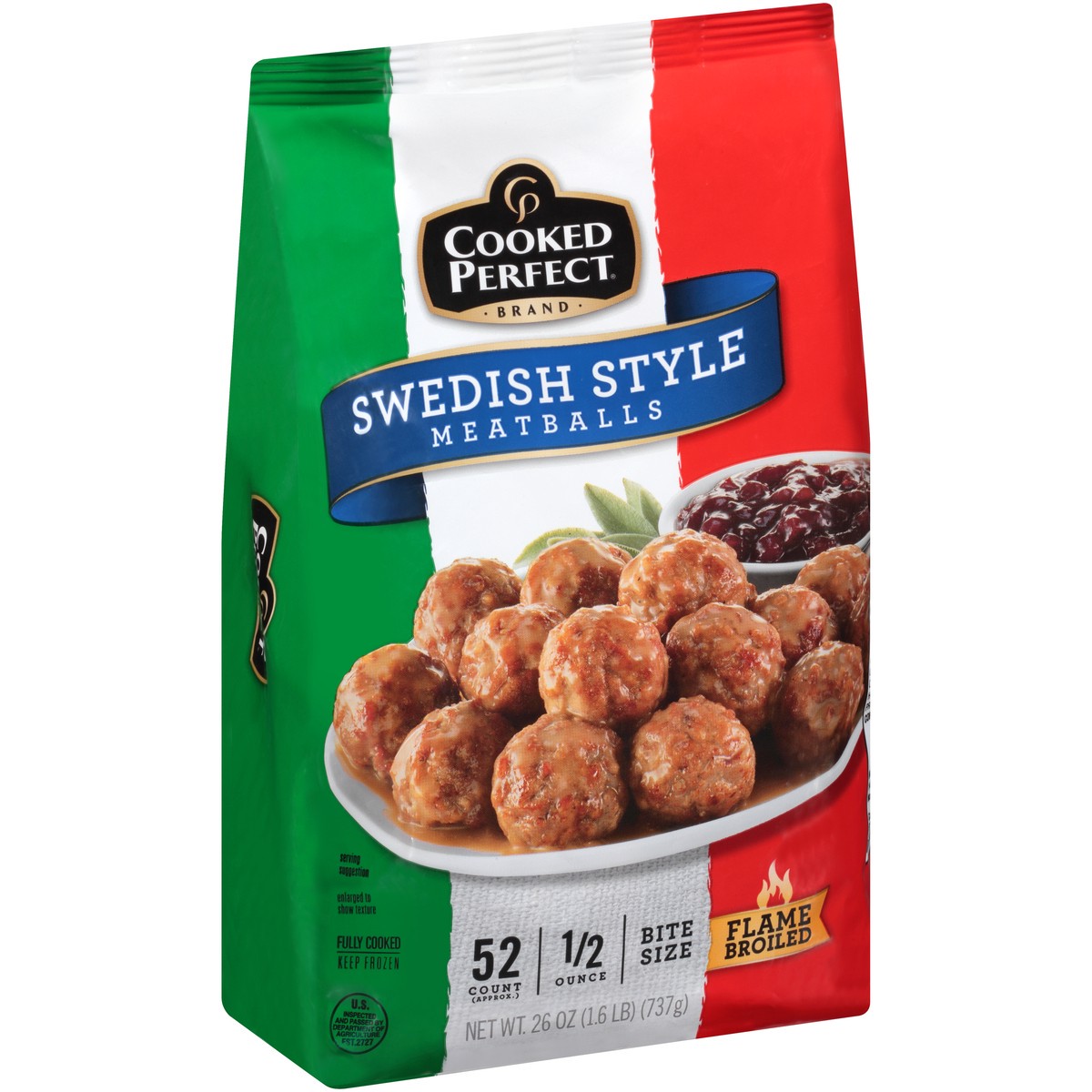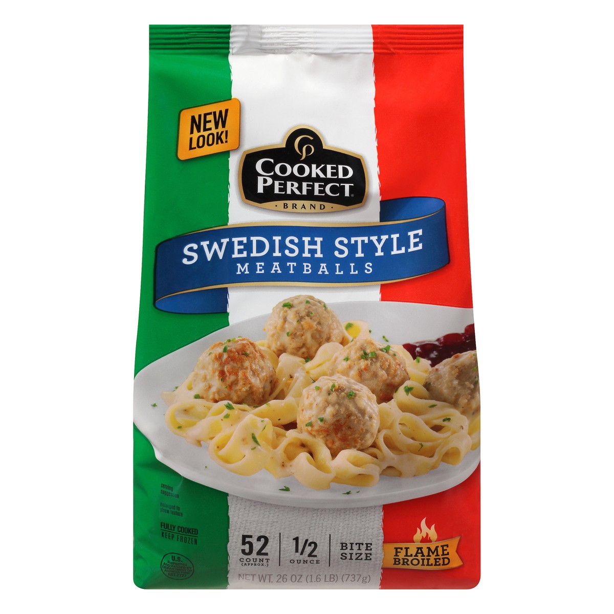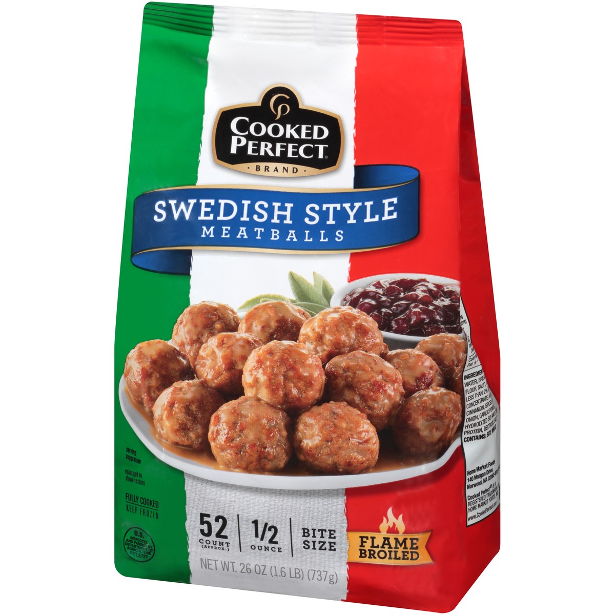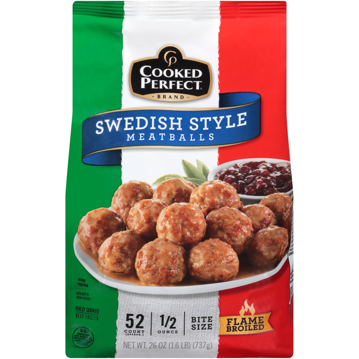 Swedish style meatballs. New look! Fully cooked. 52 count (approx.). 1/2 ounce. U.S. inspected and passed by Department of Agriculture. www.CookedPerfect.com. Facebook. Approx. 52 count. 1/2 ounce. Bi…