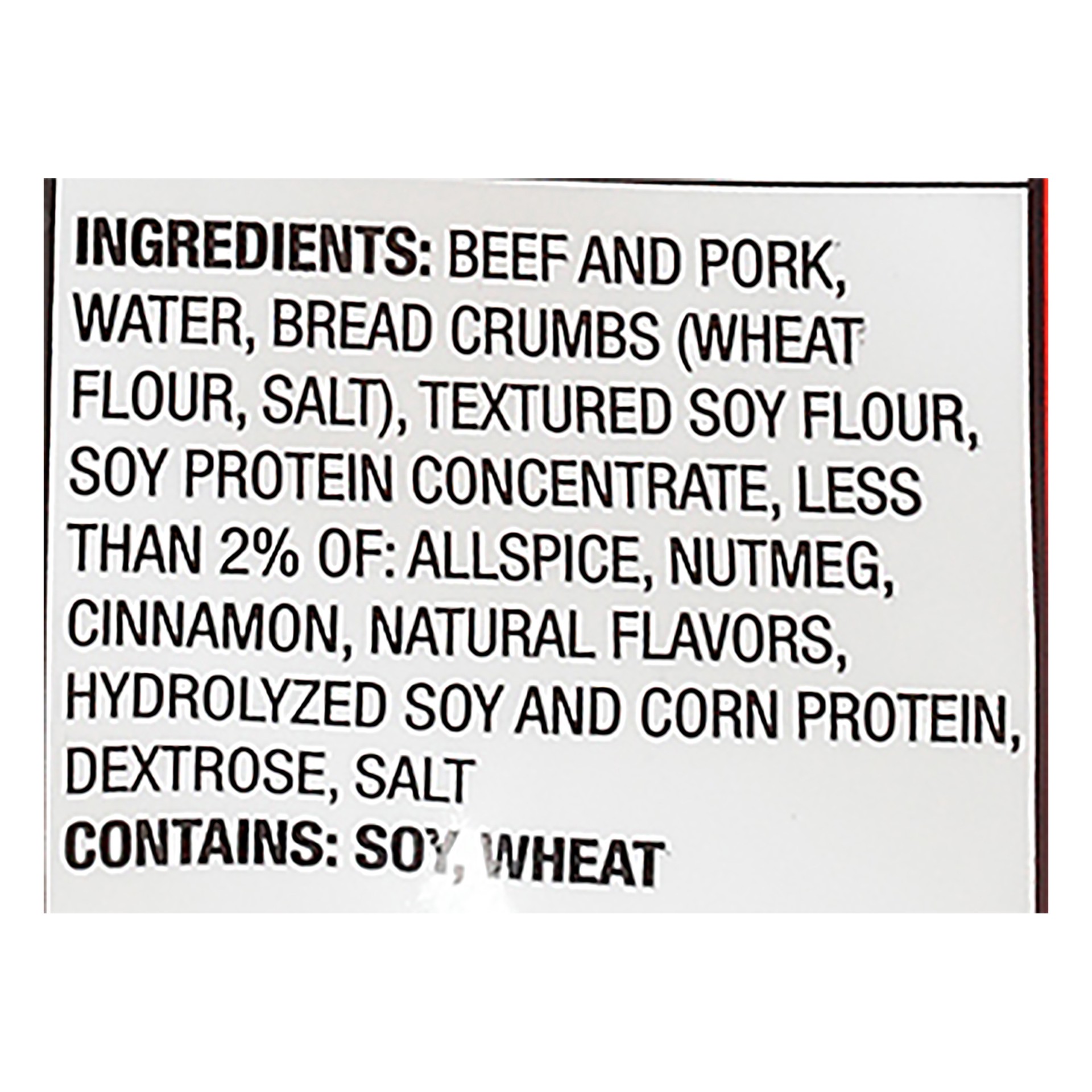 Beef and Pork, Water, Bread Crumbs (Wheat Flour, Salt), Textured Soy Flour, Soy Protein Concentrate, Less than 2% of: Allspice, Nutmeg, Cinnamon, Natural Flavors, Hydrolyzed Soy and Corn Protein, Dext…
