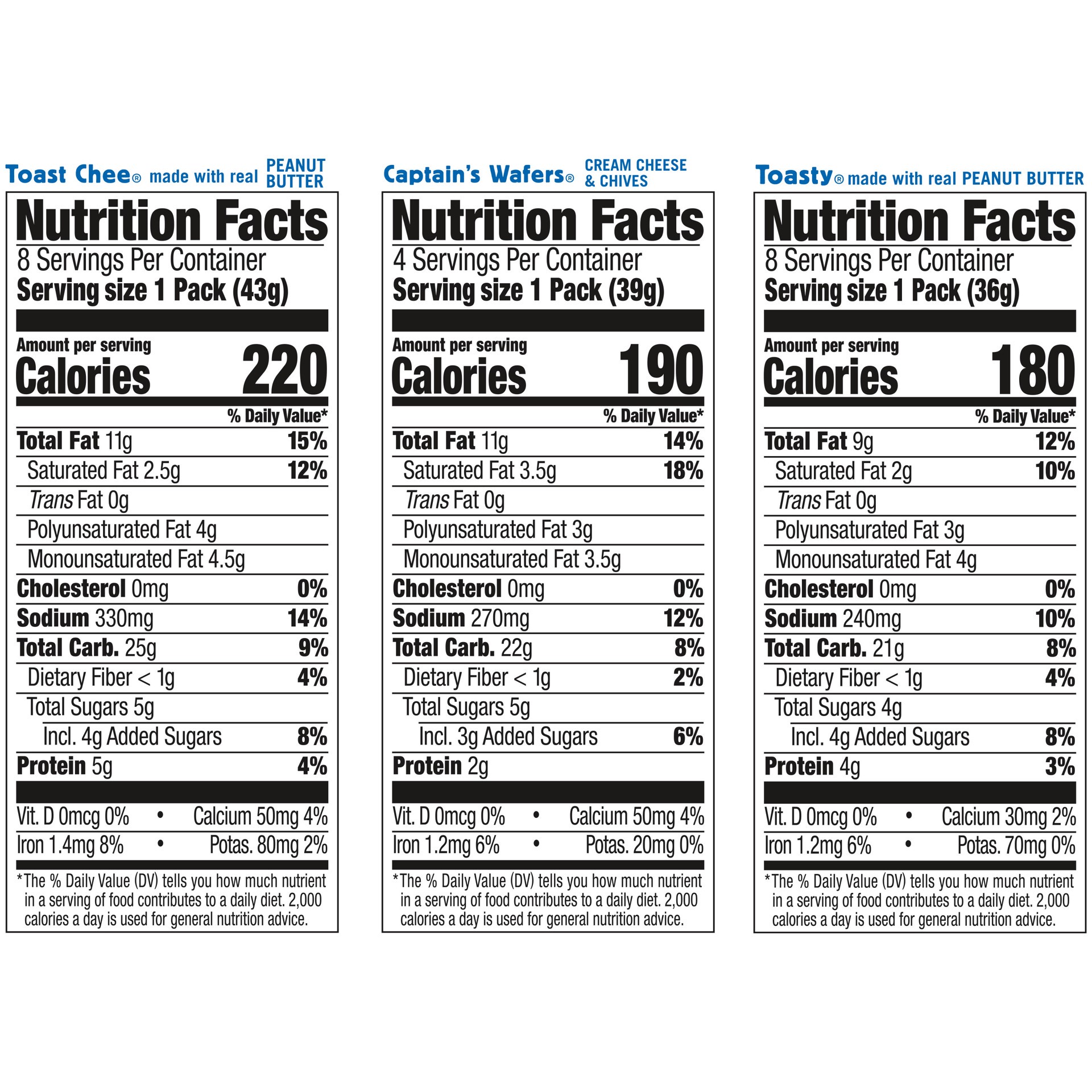 {u}ToastChee Peanut Butter Sandwich Crackers{/u} INGREDIENTS: Enriched Flour (Wheat Flour, Niacin, Reduced Iron, Thiamine Mononitrate, Riboflavin, Folic Acid), Peanut Butter (Roasted Peanuts), Vegetab…