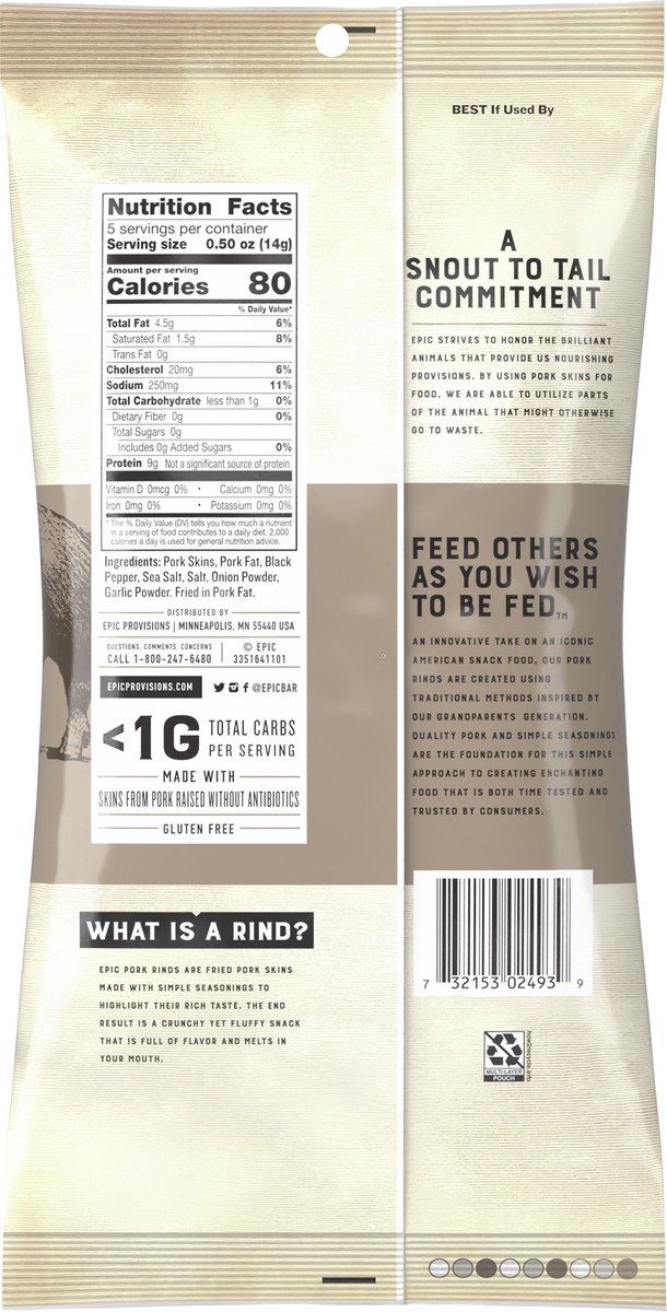 A modern take on a classic American snack, EPIC Provisions Pork Rinds are made from a blend of antibiotic-free, non-GMO, organic, and pastured pork complemented with salt and pepper. They''re gluten-f…