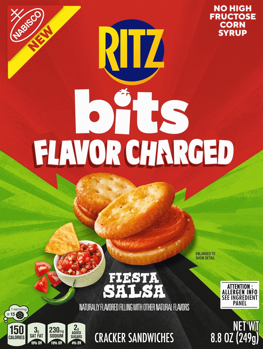 Enjoy a bold twist on the classic RITZ Bits cheese cracker sandwiches you know and love with RITZ Bits Flavor Charged Fiesta Salsa Sandwich Crackers. The bite-sized snacks layer a delicious, fiesta sa…