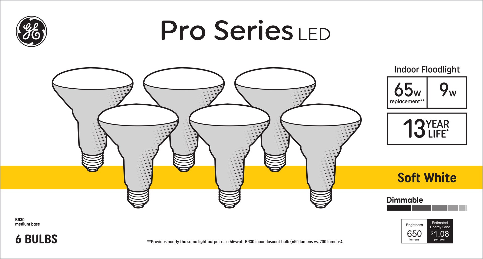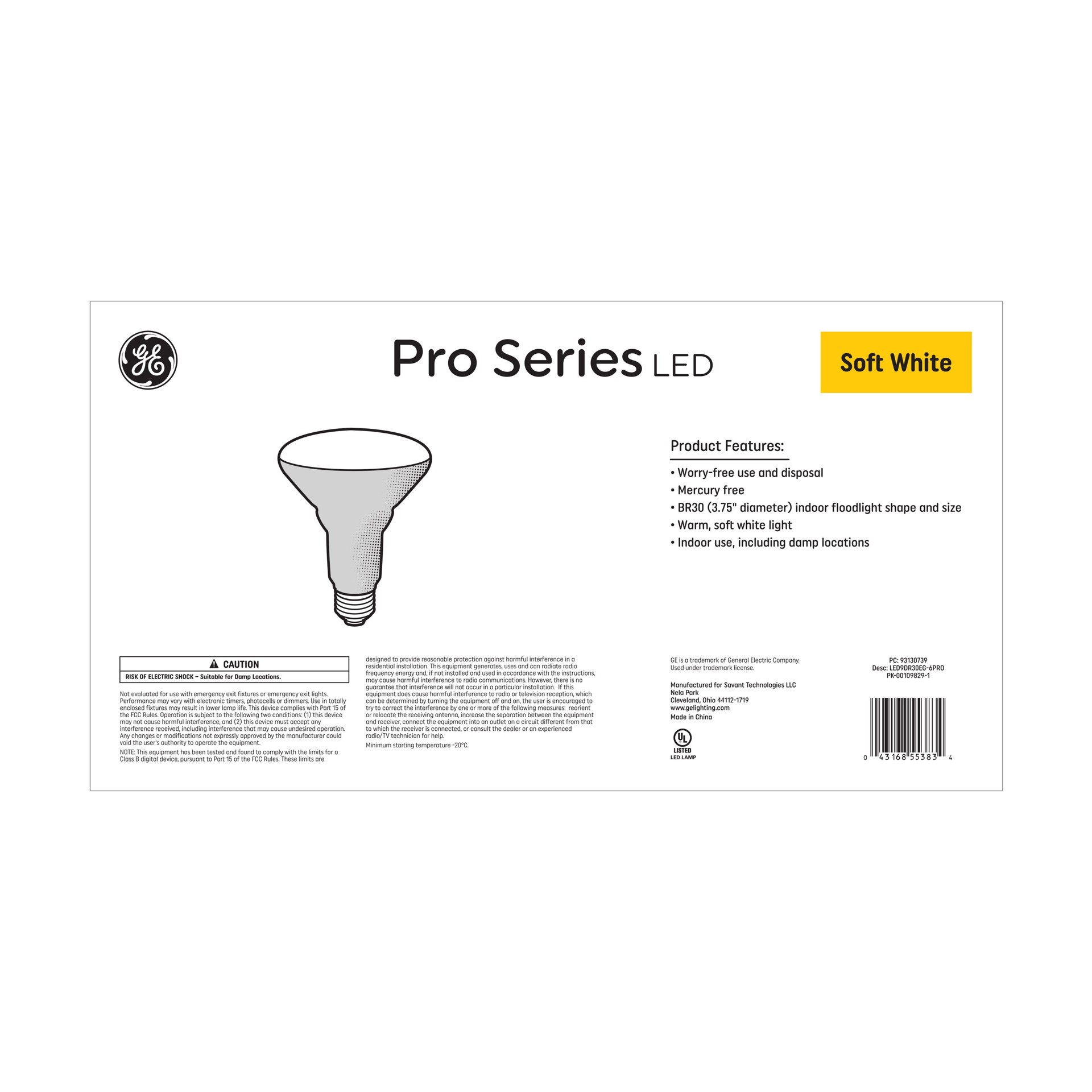 GE PRO Series 65 -Watt EQ BR30 Soft white Medium screw base E26 Dimmable LED Spot Flood Light Bulb 6 -Pack