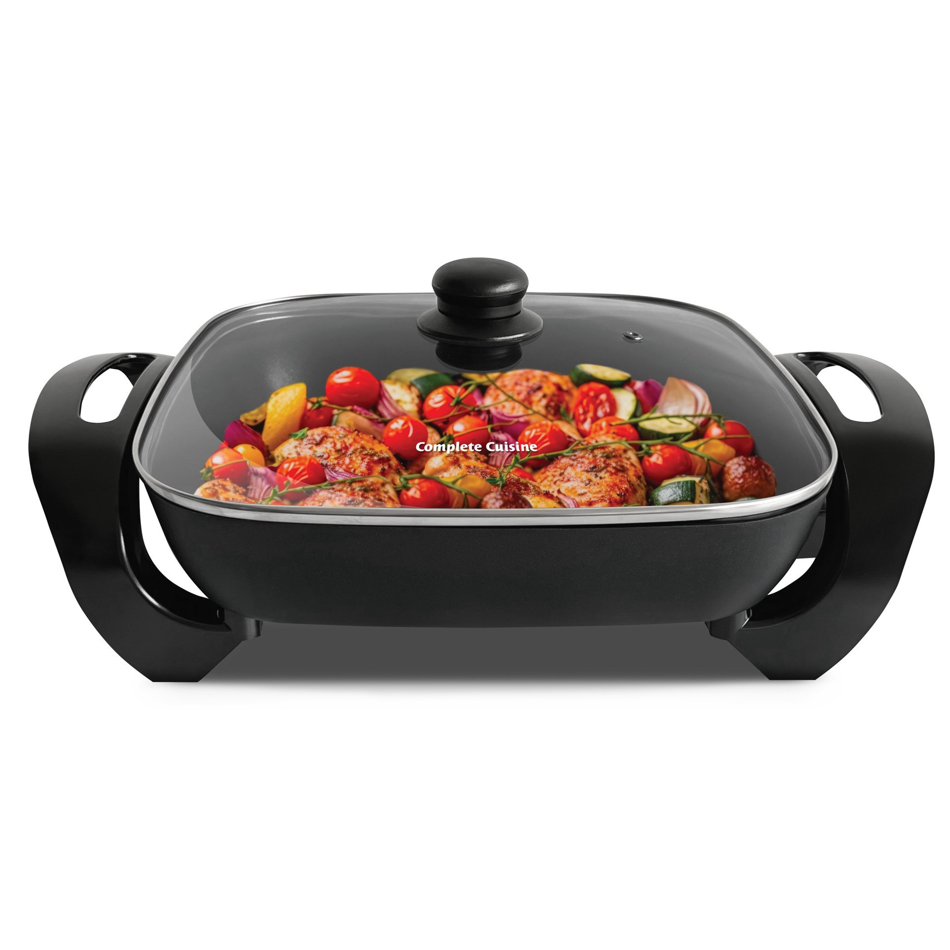 Complete Cuisine 12" Electric Skillet with Glass Lid• Family sized - 4.5 quarts• Tempered glass lid with steam vent• Adjustable temperature dial• Durable cool touch handles• Easy to clean non-stock co…
