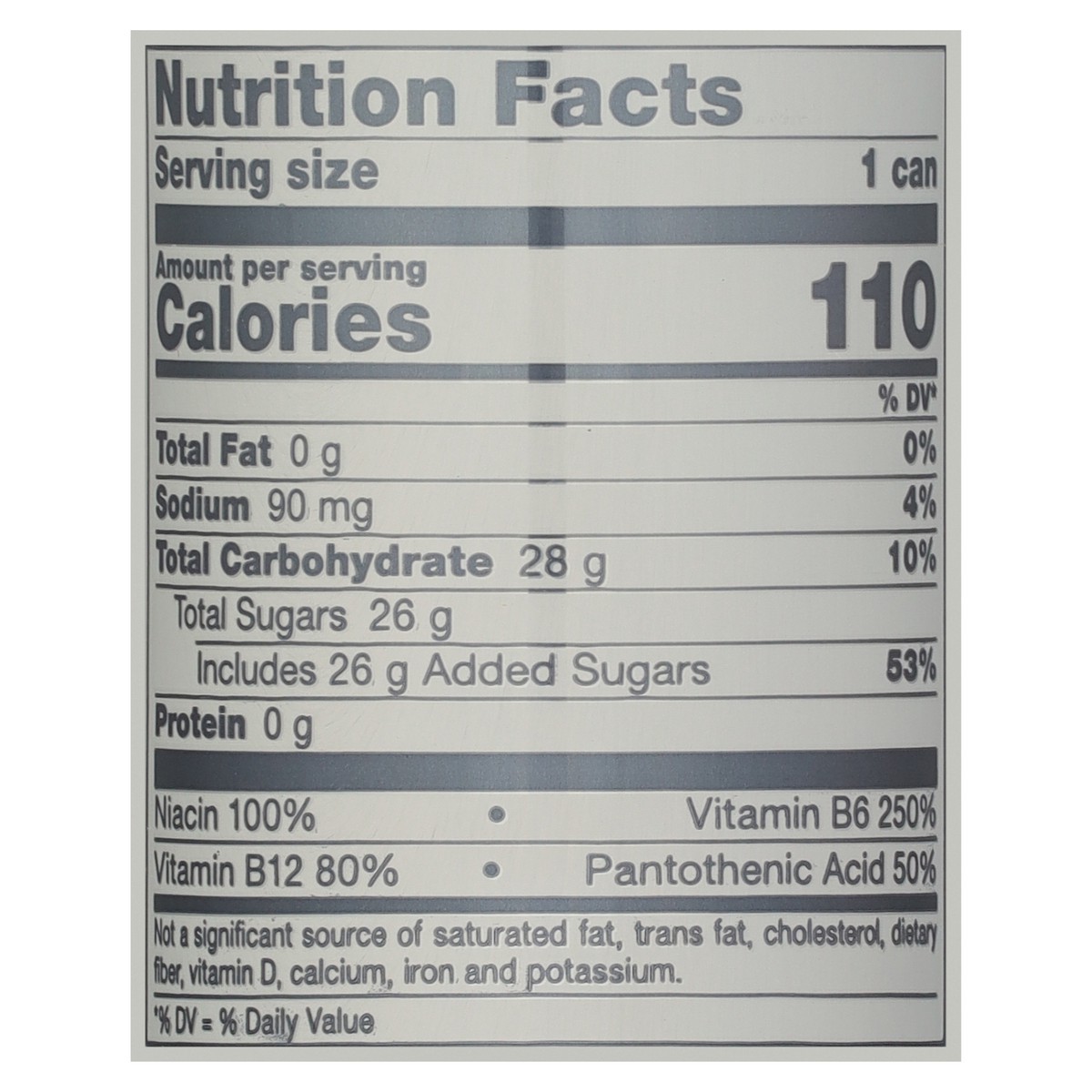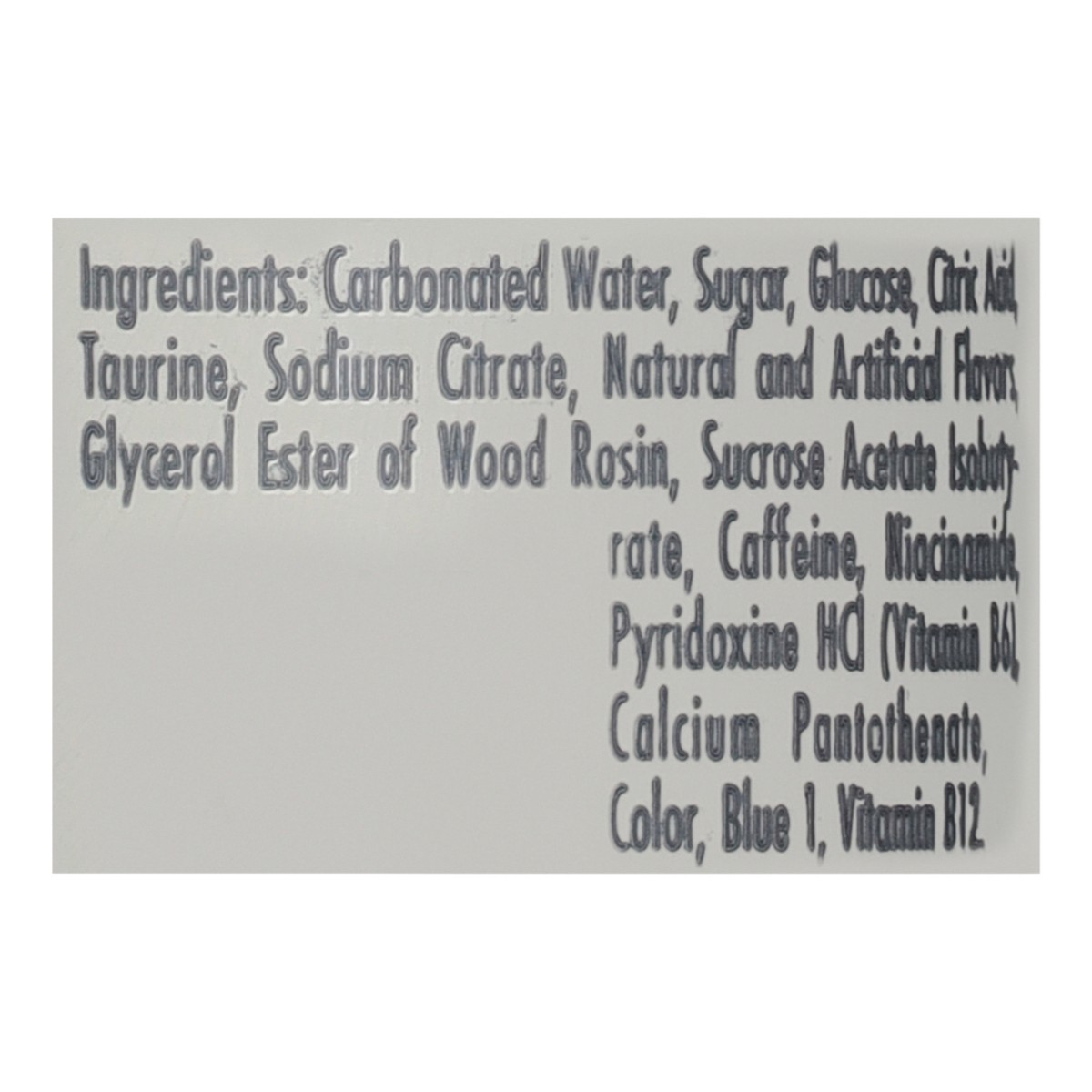 Carbonated Water, Sugar, Glucose, Citric Acid, Taurine, Sodium Citrate, Natural and Artificial Flavors, Glycerol Ester of Wood Rosin, Sucrose Acetate Isobutyrate, Caffeine, Niacinamide, Pyridoxine HCI…