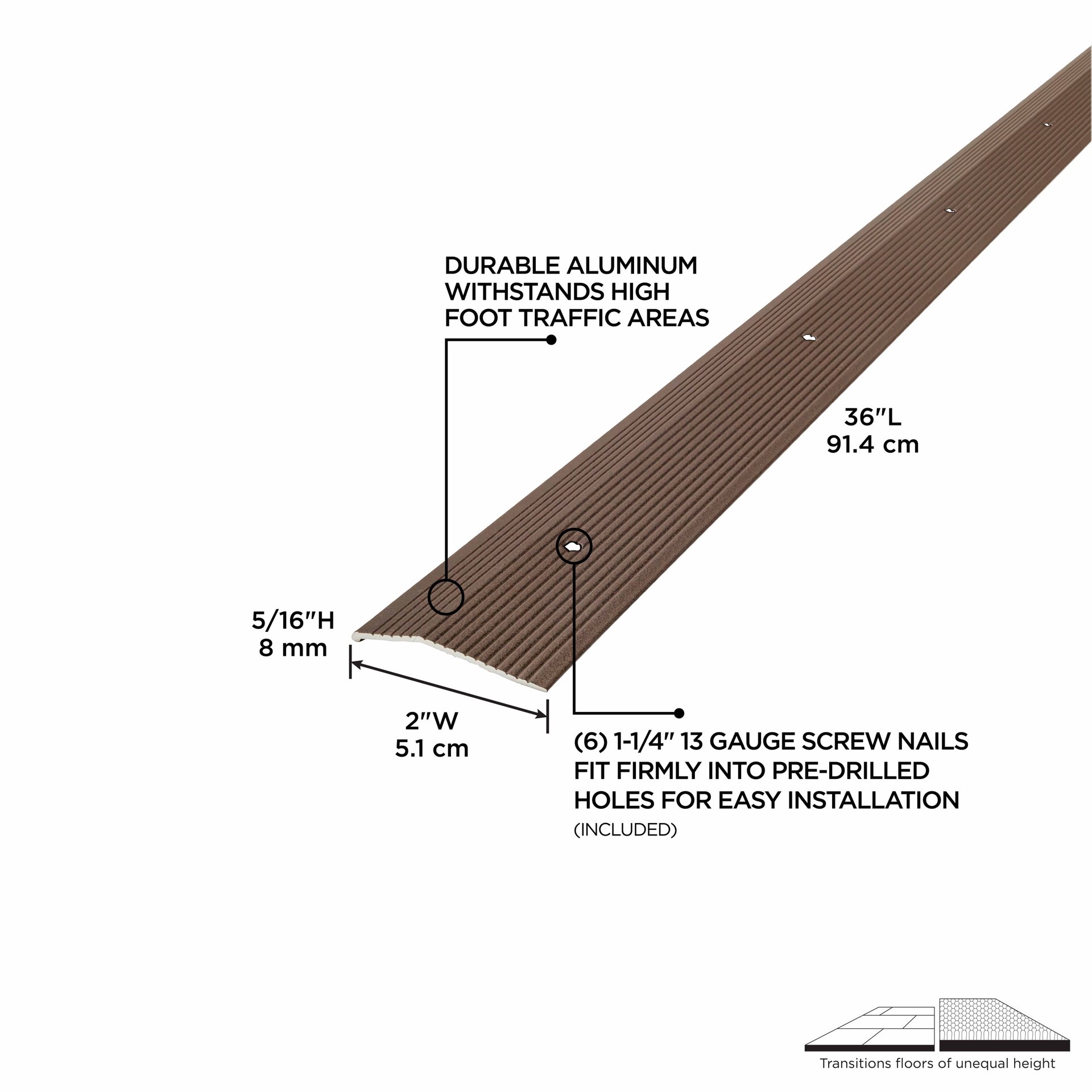 Durable aluminum withstands high foot traffic areas in the home. For use in doorways, room entryways or other locations where two unequal height flooring surfaces meet. Screw Nails fit firmly in pre-d…