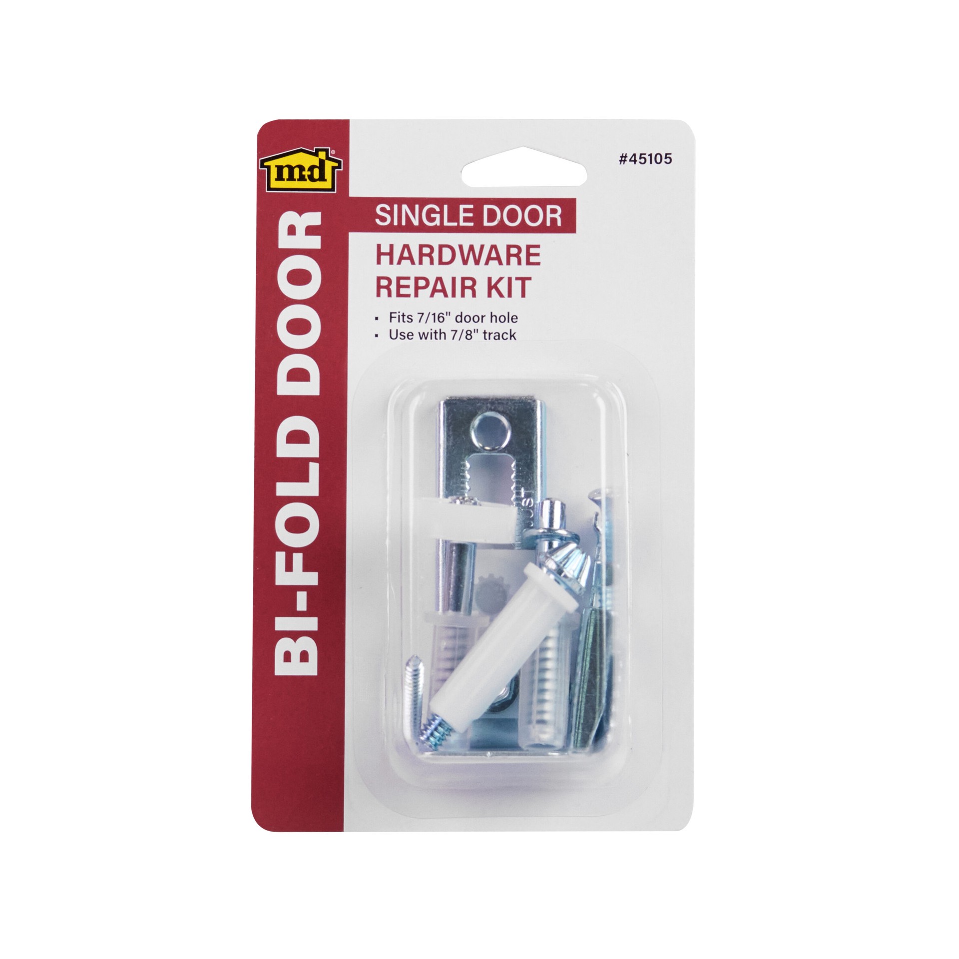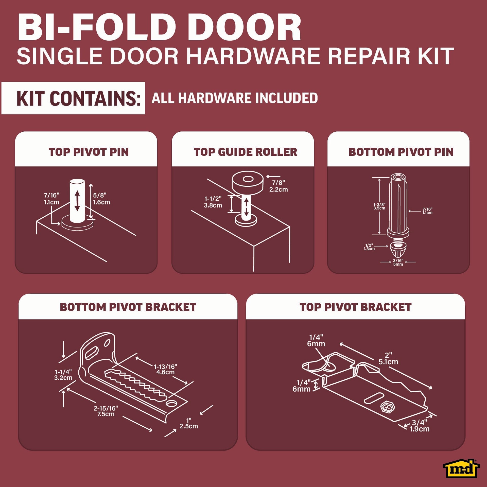 Top guide roller, top pivot pin and bracket, bottom pivot pin and bracket for bi-fold closet door applications. Steel pins and brackets, nylon guide roller. Fits 7/8" track and 7/16" door holes.