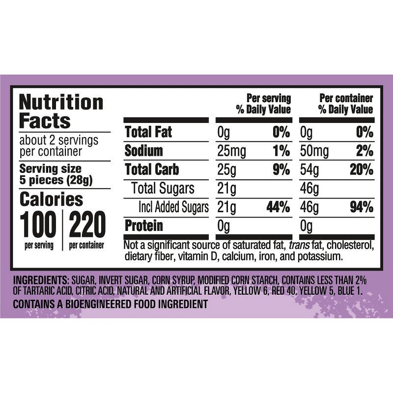 SUGAR, INVERT SUGAR, CORN SYRUP, MODIFIED CORN STARCH, CONTAINS LESS THAN 2% OF TARTARIC ACID, CITRIC ACID, NATURAL AND ARTIFICIAL FLAVOR, YELLOW 6, RED 40, YELLOW 5, BLUE 1.