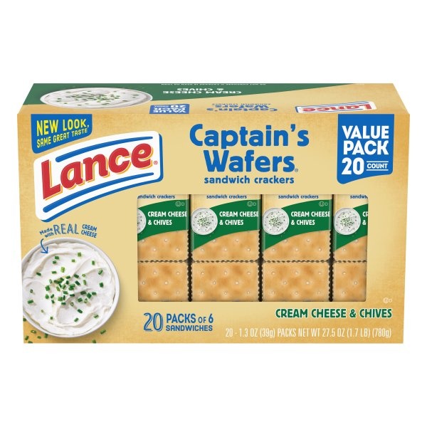 Get a delicious, full-flavored bite whenever the craving strikes. Lance Captain''s Wafers Cream Cheese and Chives filled Sandwich Crackers make a wonderful savory snack. They feature a delicious blend…