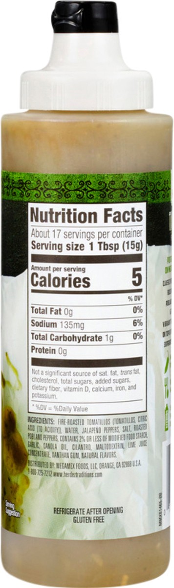 Ingredients: Fire Roasted Tomatillos (Tomatillos, Citric Acid [To Acidify]), Water, Jalapeno Peppers, Salt, Roasted Poblano Peppers, Contains 2% or less of Modified Food Starch, Garlic, Canola Oil, Ci…