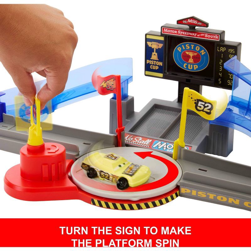 Relive the iconic opening race from the original Disney and Pixar Cars movie with the Piston Cup Playset featuring two ways to play! In crash mode, wind up the yellow caution flag to put the crash zon…