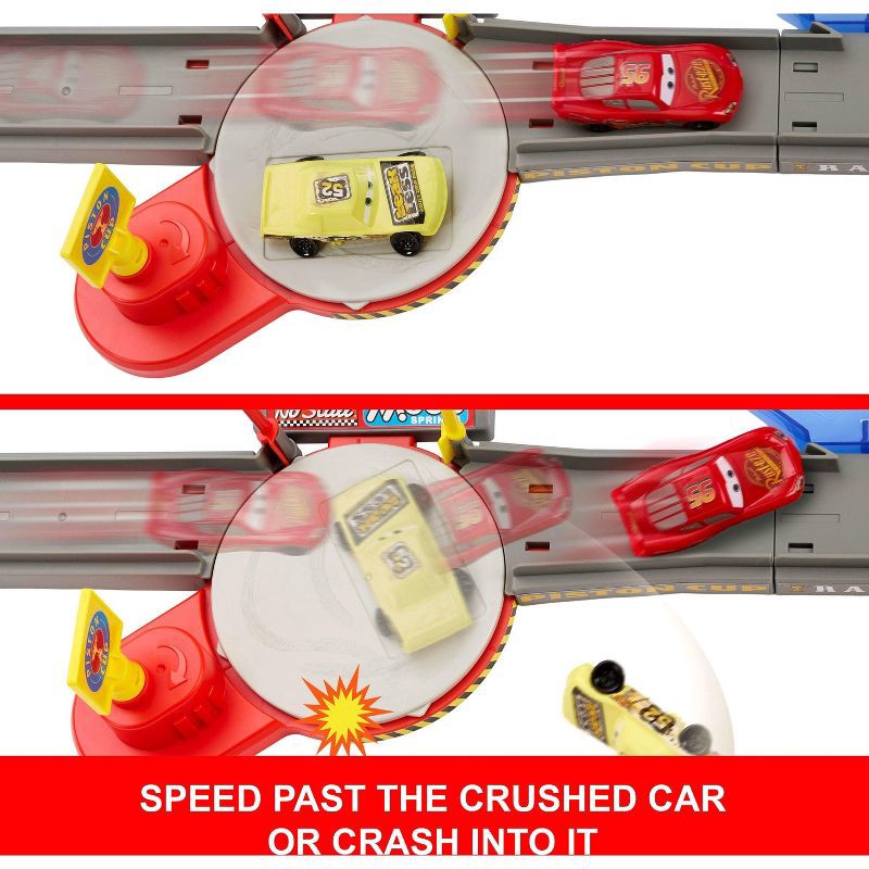 - Race and crash with a tongue-out Lightning McQueen in the Disney and Pixar Cars Piston Cup Playset!
