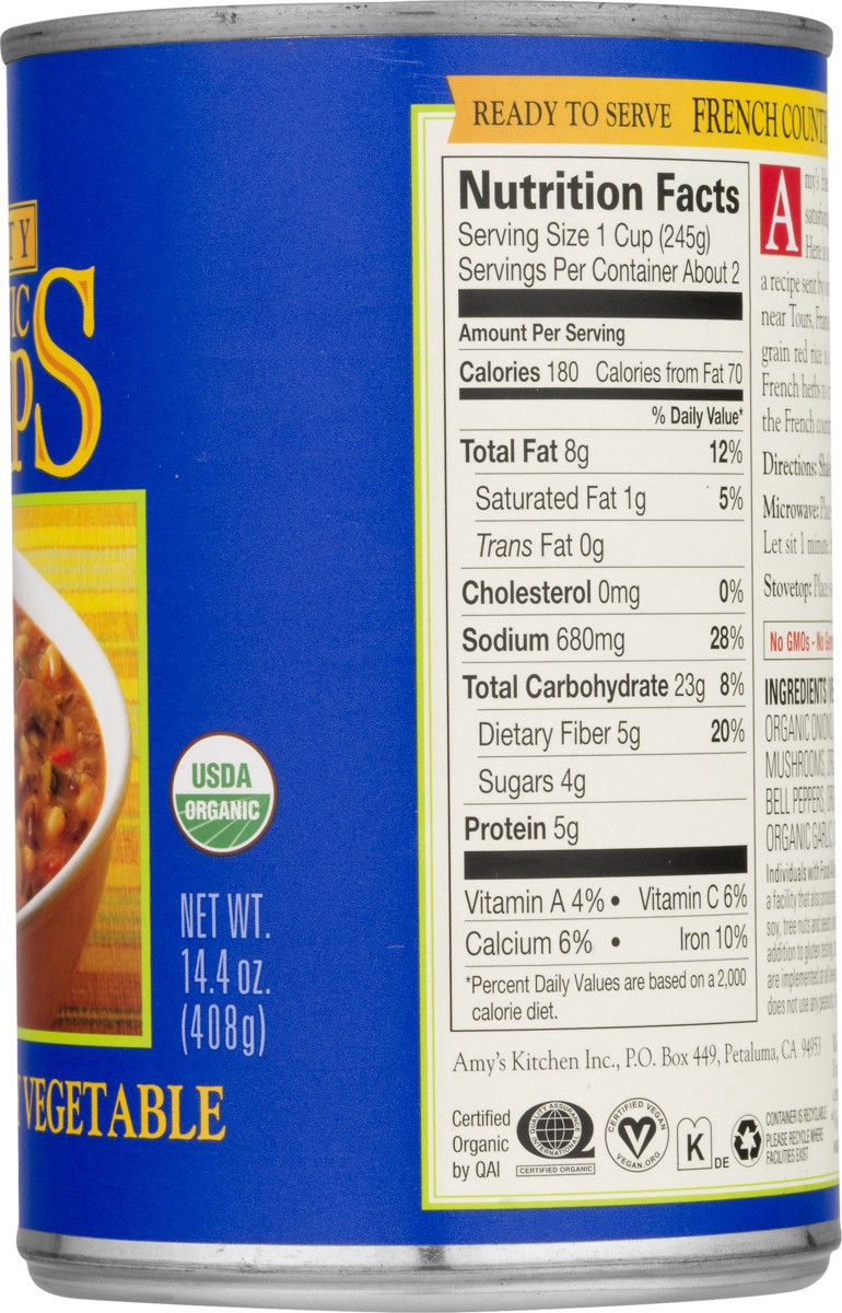 Amy''s Organic Hearty French Country Vegetable Soup starts with organic, long-grain red rice that is slowly simmered with organic vegetables and traditional herbs. This creates a delectably robust sou…