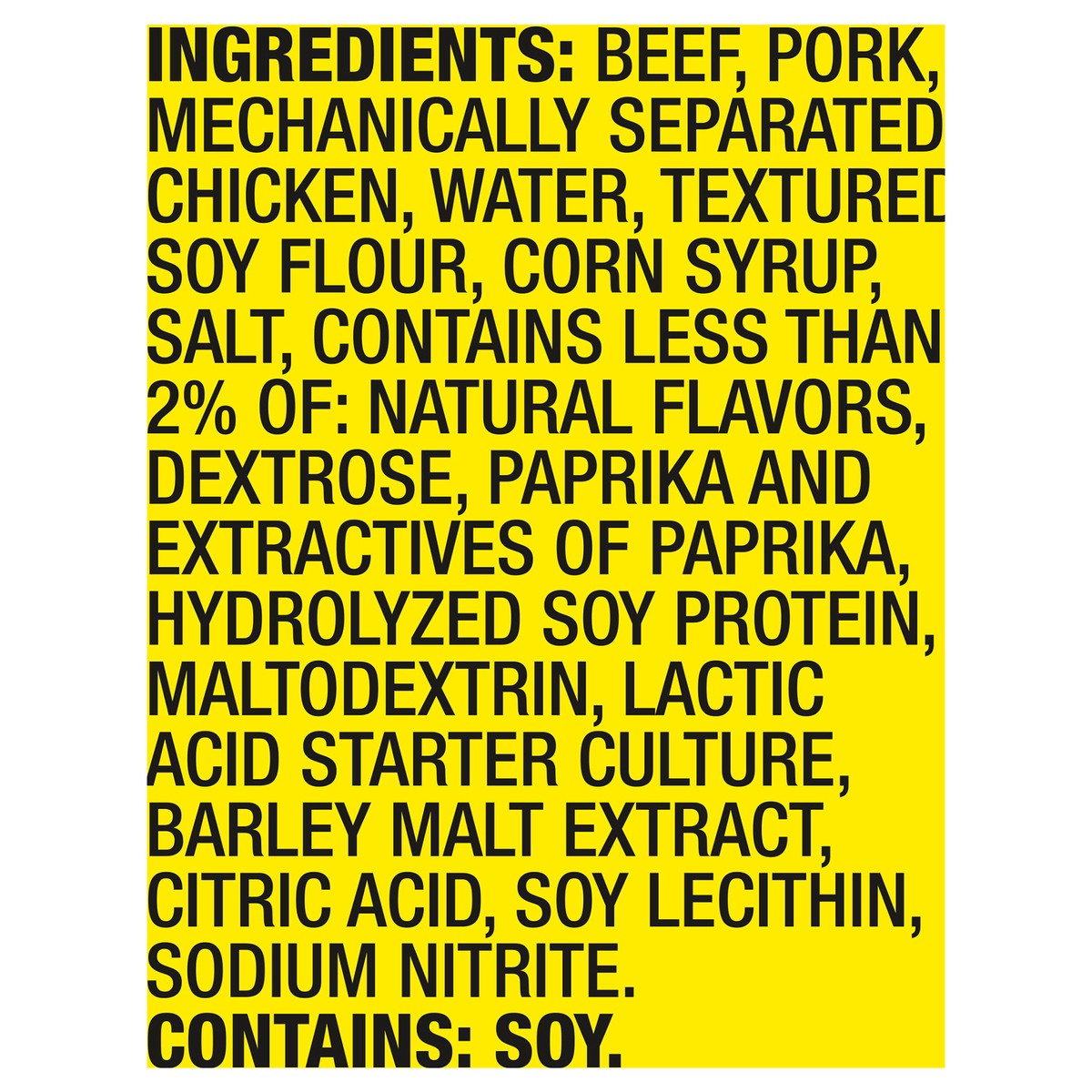 Beef, Pork, Mechanically Separated Chicken, Water, Textured Soy Flour, Corn Syrup, Salt, Contains Less than 2% of: Natural Flavors, Dextrose, Paprika and Extractives of Paprika, Hydrolyzed Soy Protein…