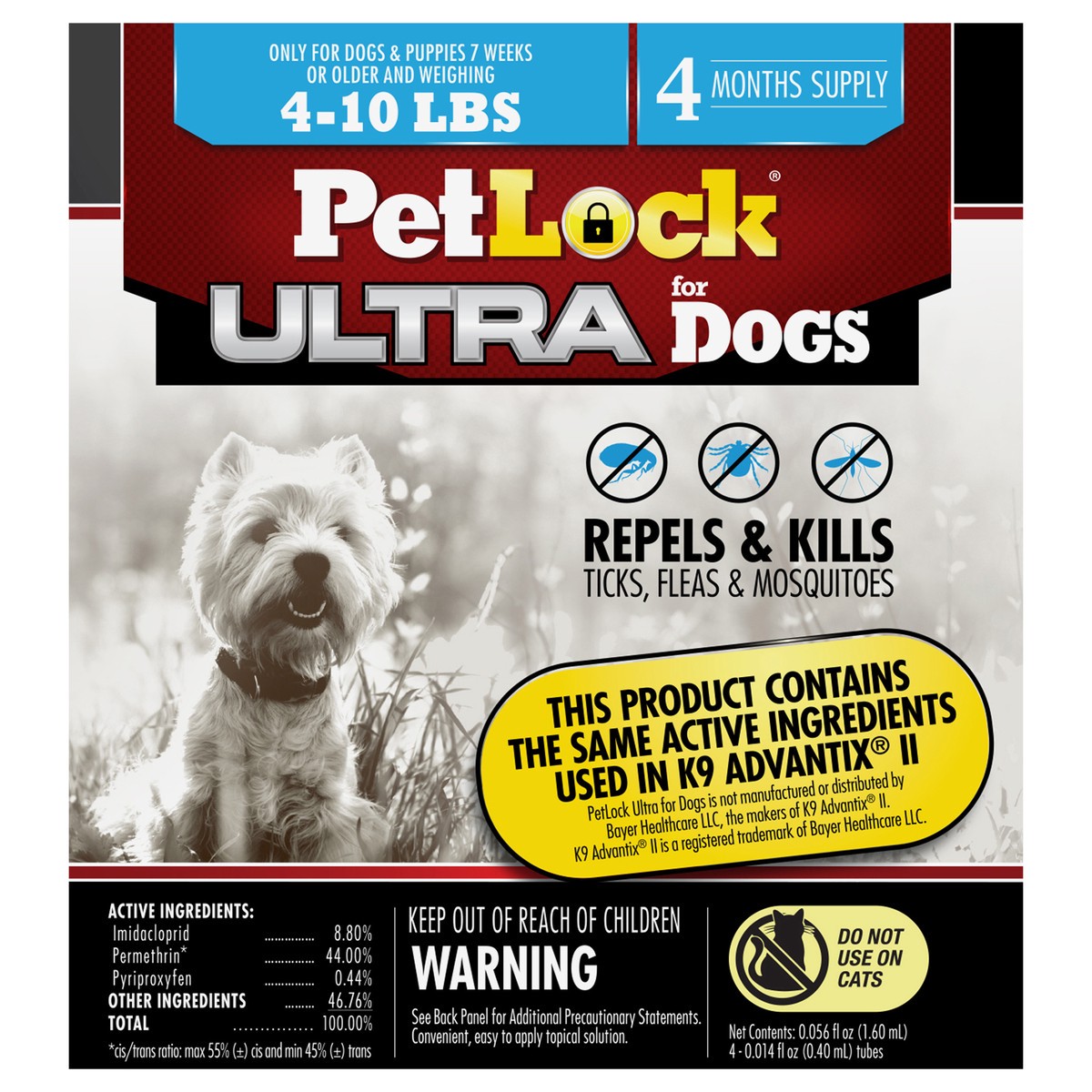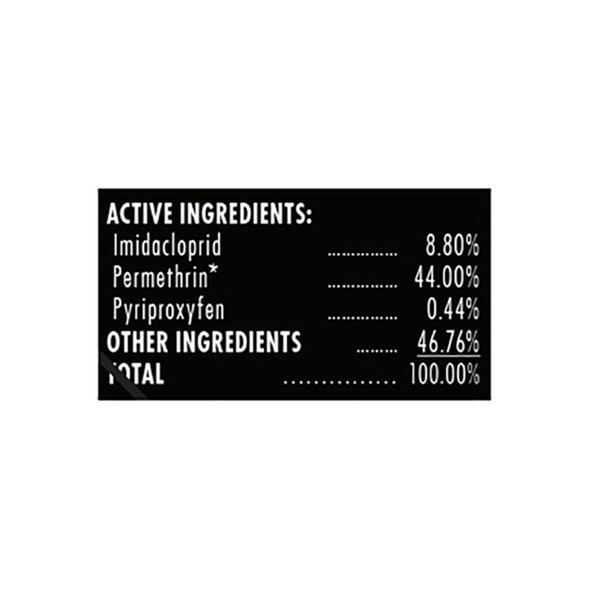 Active Ingredients: Imidacloprid: 8.80%, Permethrin* 44.00%, Pyriproxyfen: 0.44%. Other Ingredients: 46.76%, Total: 100.00%, * Cis/Trans Ratio: Max 55% Plus or Minus Cis and Min 45% Plus or Minus Tran…