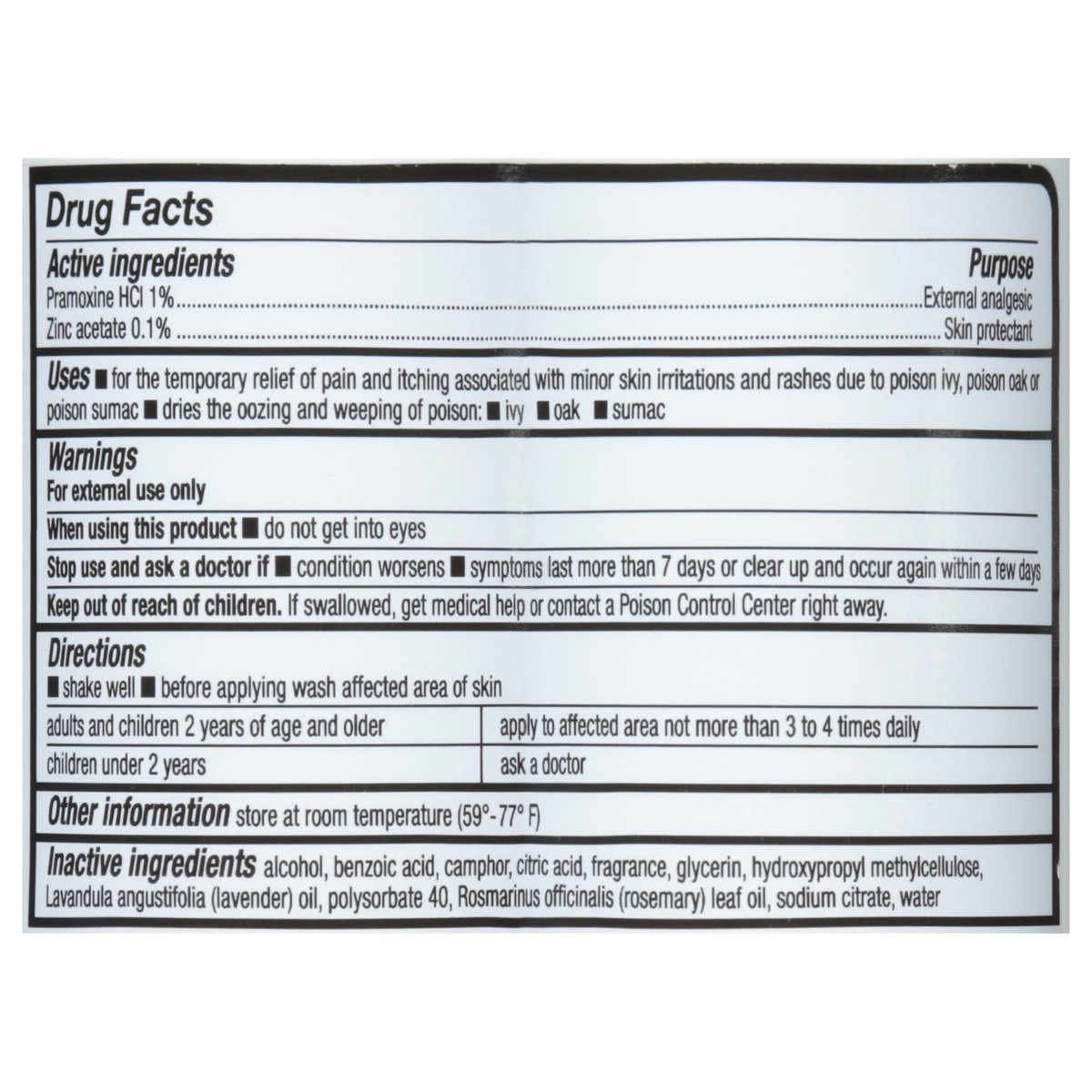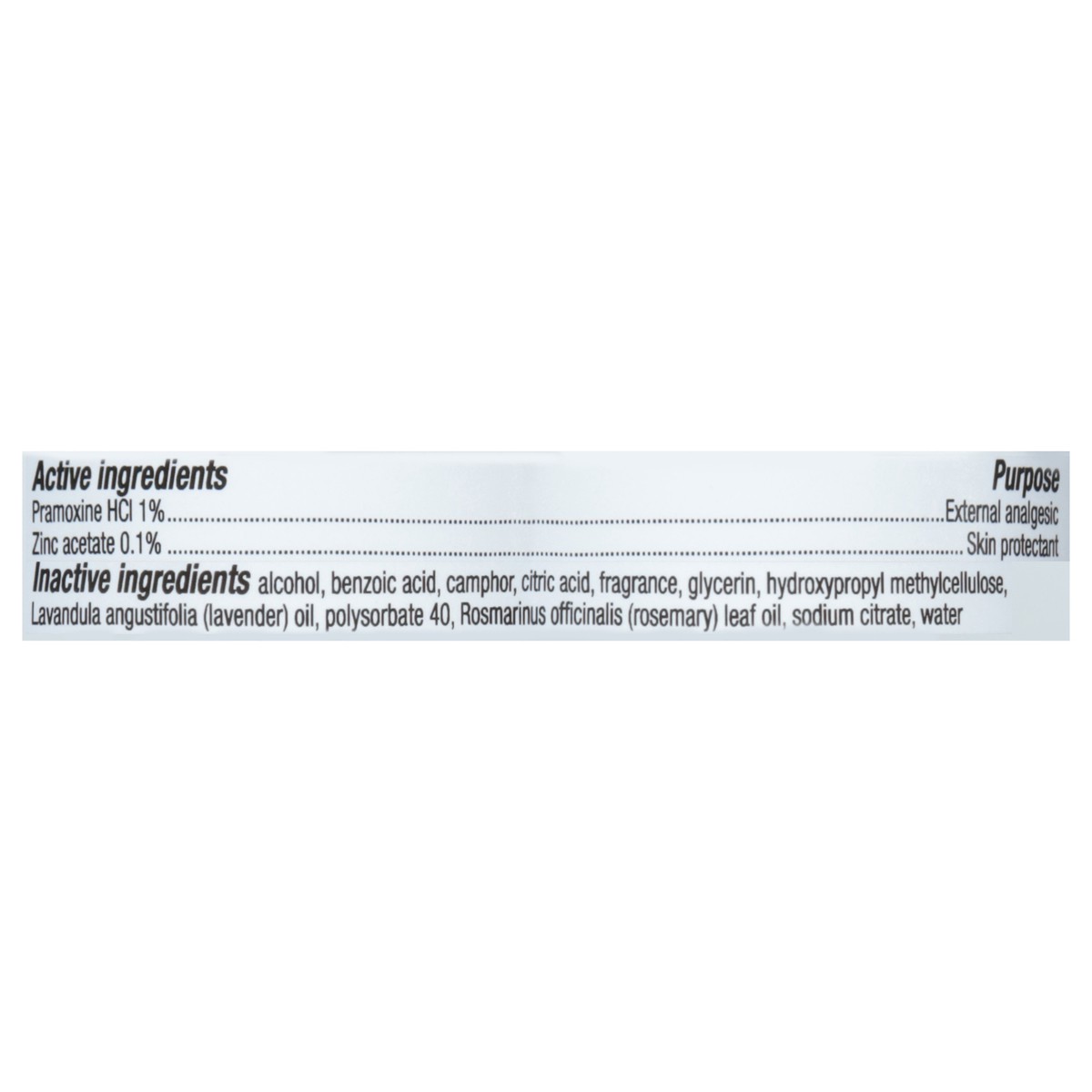 Active Ingredients: Pramoxine HCI (1 %), External Analgesic.; Zinc Acetate (0.1 %), Skin Protectant. Inactive Ingredients: Alcohol, Benzoic Acid, Camphor, Citric Acid, Fragrance, Glycerin, Hydroxpypro…