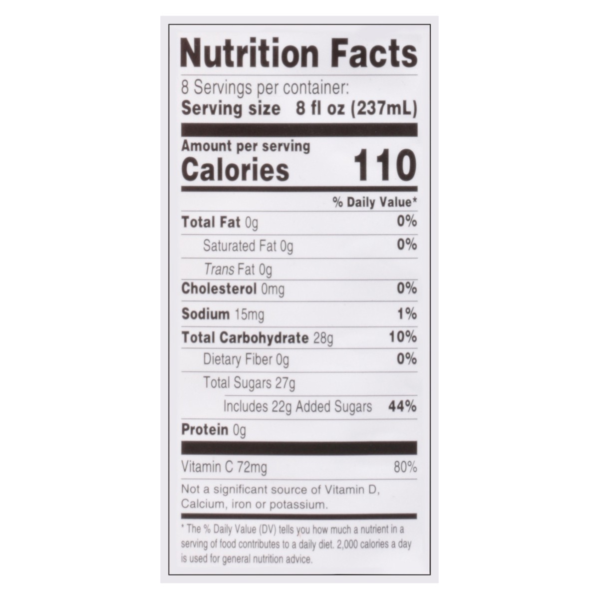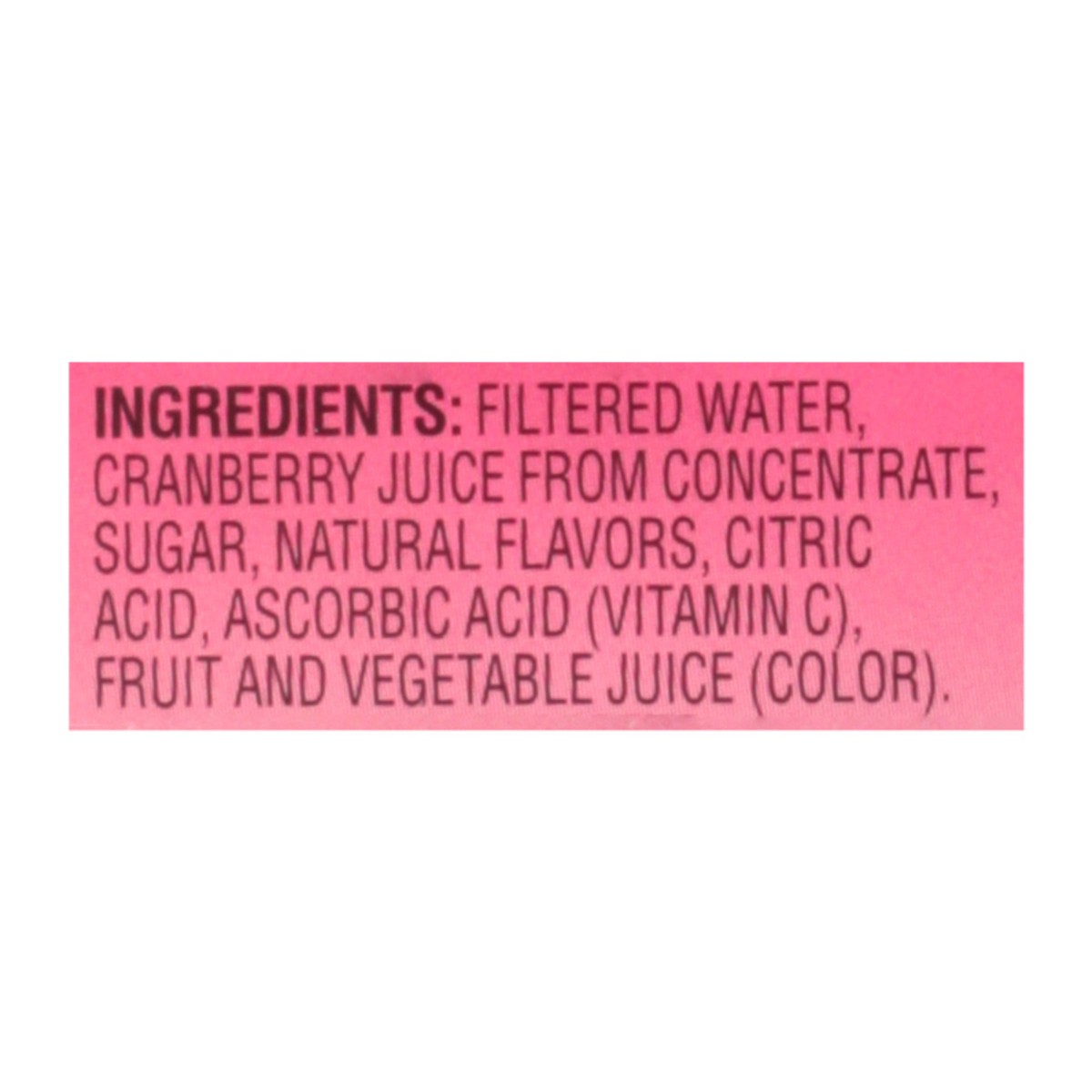 Filtered Water, Cranberry Juice from Concentrate, Sugar, Natural Flavors, Citric Acid, Ascorbic Acid (Vitamin C), Fruit and Vegetable Juice (Color).