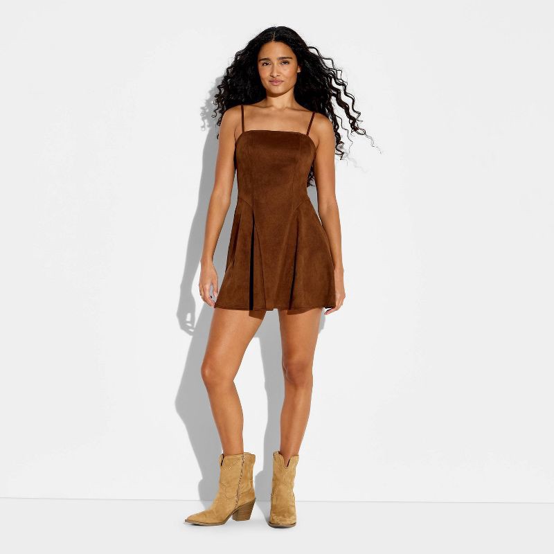 Brown faux-suede skater dress from Wild Fable™ with a flattering mini length. Crafted from heavyweight recycled polyester fabric with spandex for comfortable wear that moves and stretches with you. Fe…