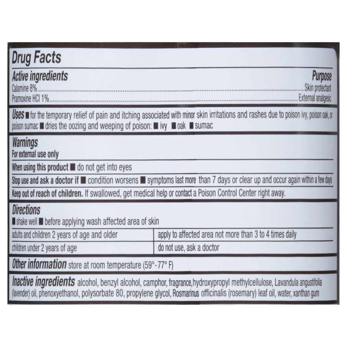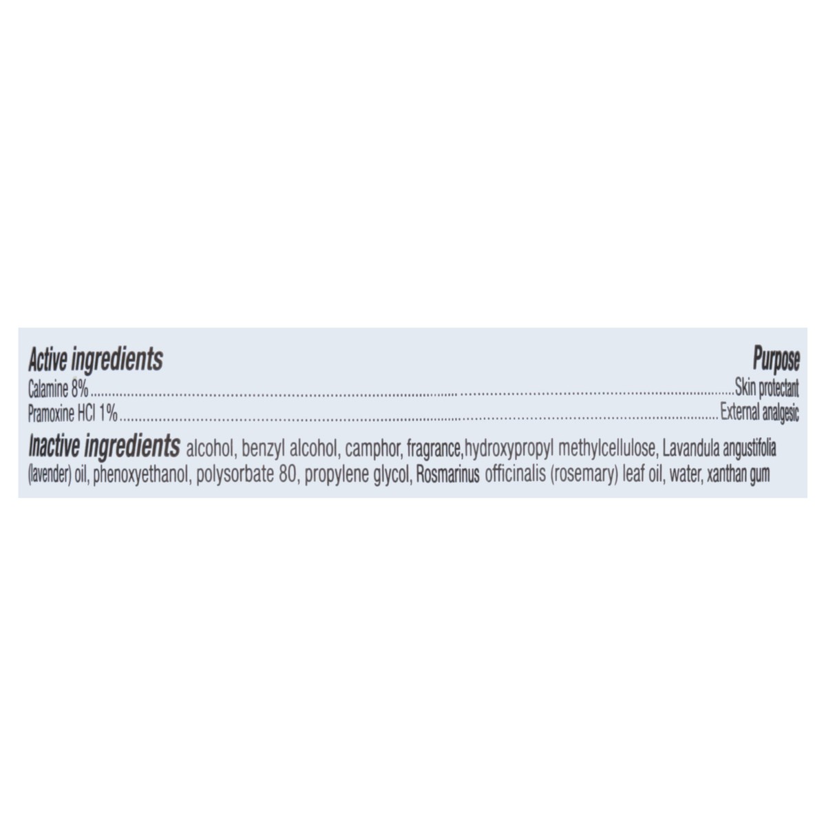Active Ingredients: Calamine (8 %), Skin Protectant.; Pramoxine HCI (1 %), External Analgesic. Inactive Ingredients: Alcohol, Benzyl Alcohol, Camphor, Fragrance, Hydroxypropyl Methylcellulose, Lavandu…