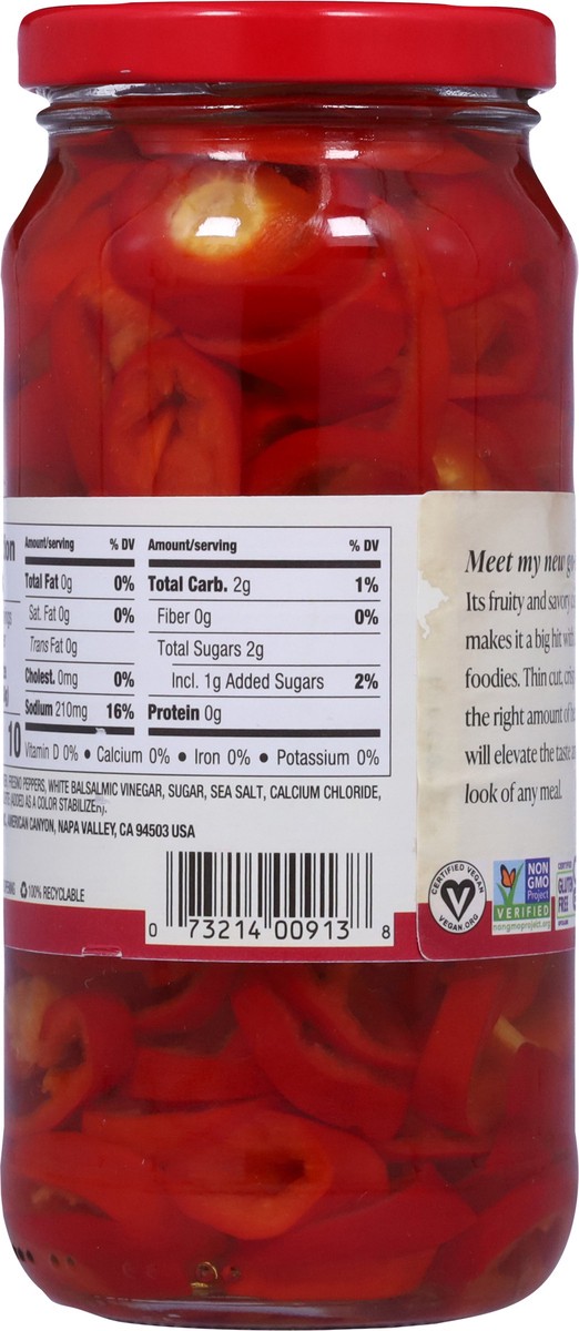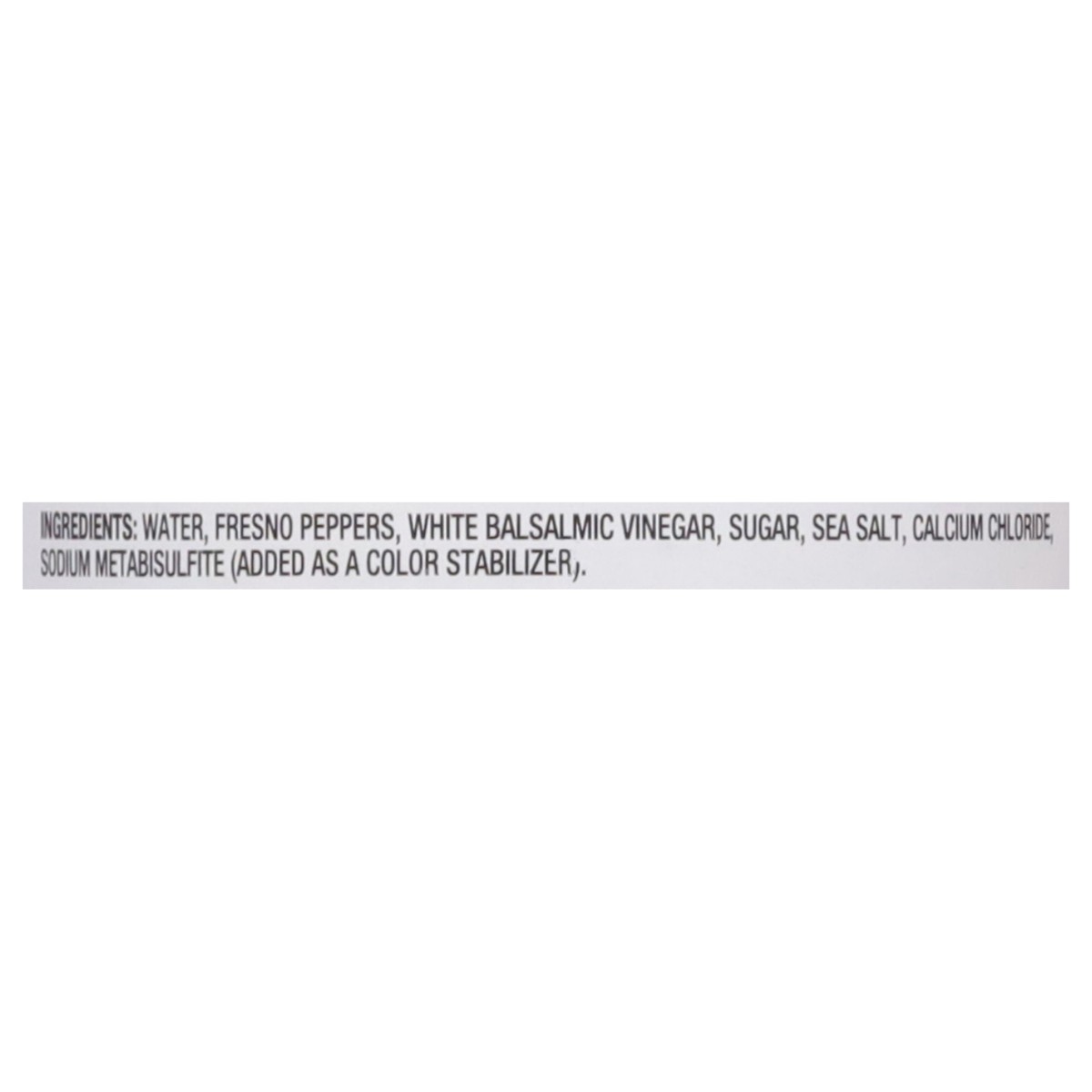 Water, Fresno Peppers, White Balsalmic Vinegar, Sugar, Sea Salt, Calcium Chloride, Sodium Metabisulfite (Added as a Color Stabilizer).