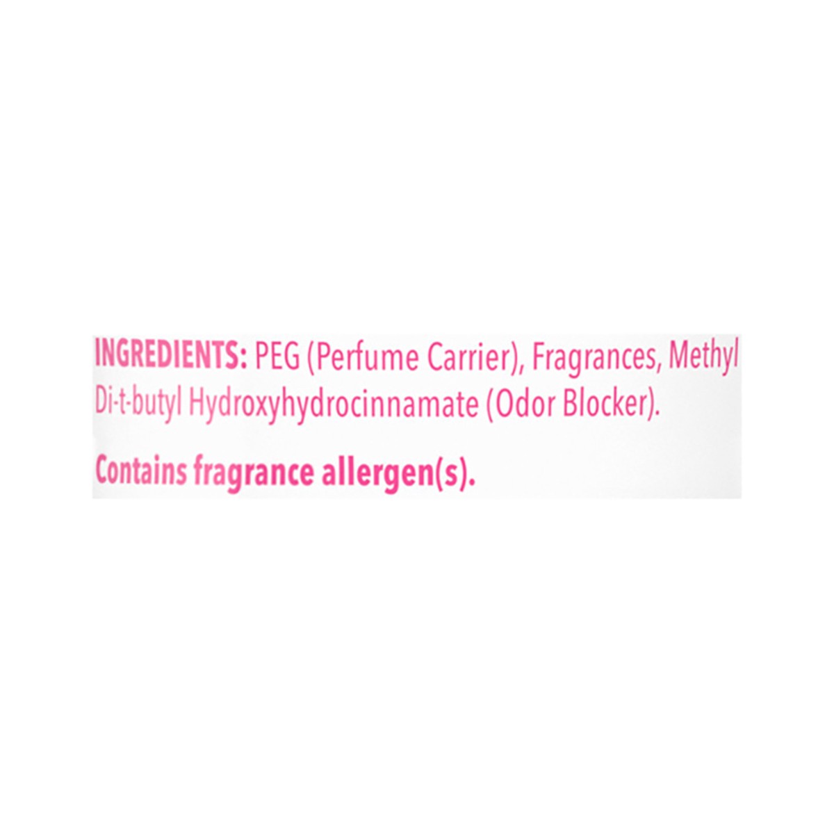 PEG (Perfume Carrier), Fragrances, Methyl Di-T-Butyl Hydroxyhydrocinnamate (Odor Blocker).