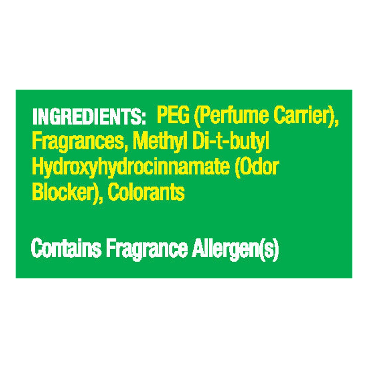 PEG (Perfume Carrier), Fragrances, Methyl Di-T-Butyl Hydroxyhydrocinnamate (Odor Blocker), Colorants.