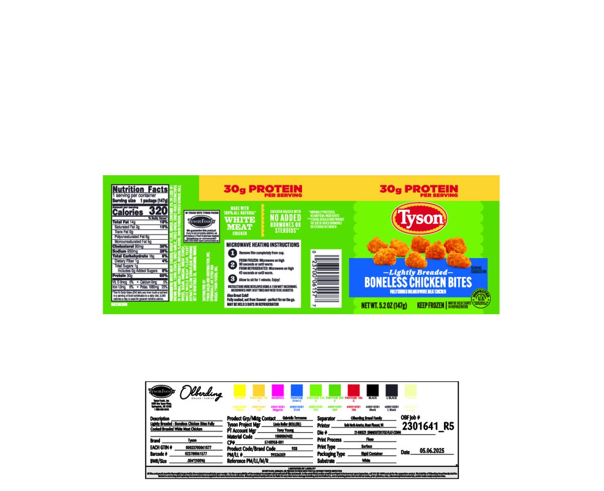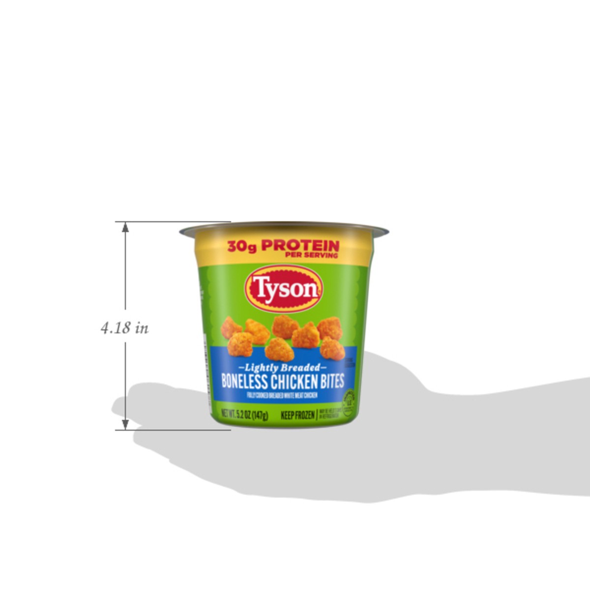 - One 5.2 oz cup of Tyson Lightly Breaded Boneless Chicken Bites