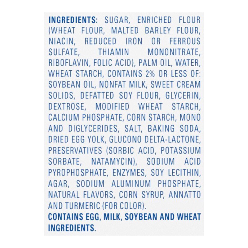 Sugar, Enriched Flour (Wheat Flour, Malted Barley Flour, Niacin, Reduced Iron or Ferrous Sulfate, Thiamin Mononitrate, Riboflavin, Folic Acid), Palm Oil, Water, Wheat Starch, Contains 2% or Less of: S…