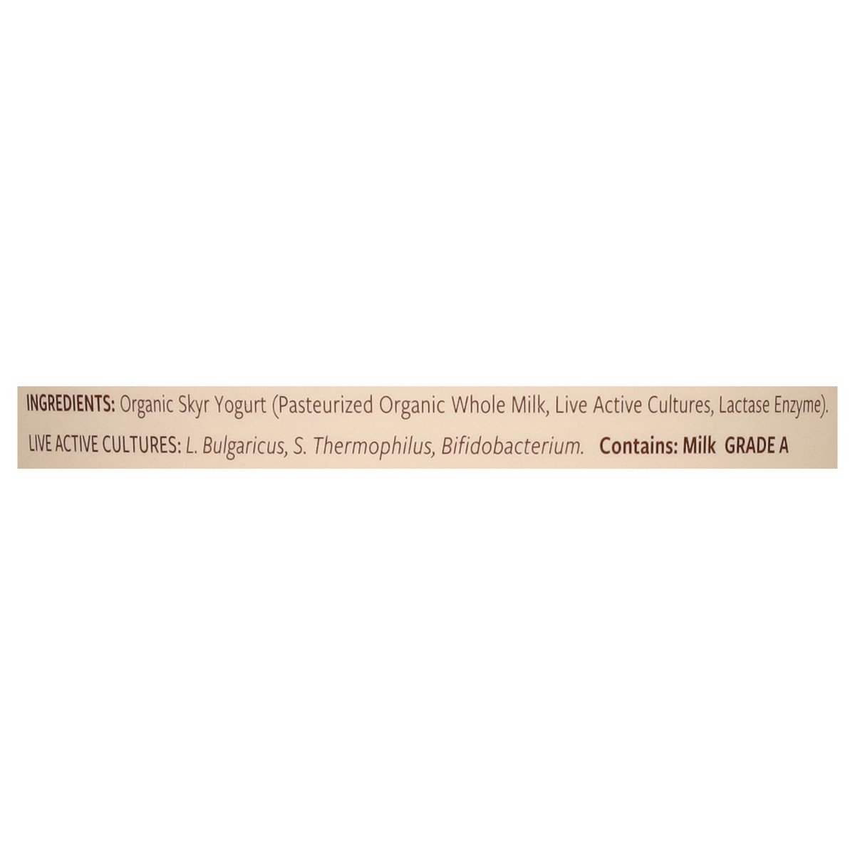 Organic Skyr Yogurt (Pasteurized Organic Whole Milk, Live Active Cultures, Lactase Enzyme), Live Active Cultures: L. Bulgaricus, S. Thermophilus, Bifidobacterium.