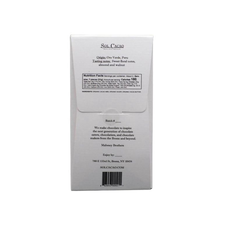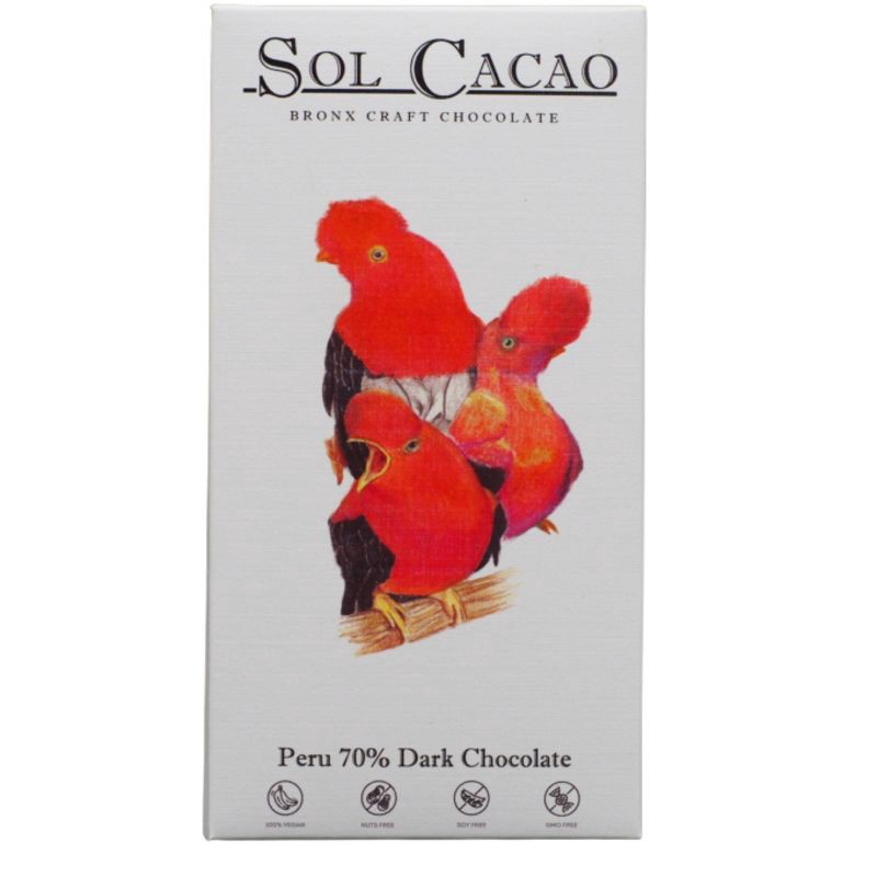 A dark chocolate bar with a smooth chocolatey melt. This bar is produced using Peruvian cacao beans from Oro Verde. At 70% cacao, this bar has a bright and dried fruit flavor.