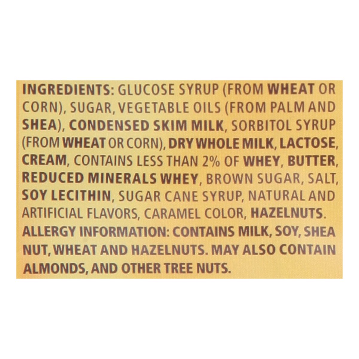 Glucose Syrup (from Wheat or Corn), Sugar, Vegetable Oils (from Palm and Shea), Condensed Skim Milk, Sorbitol Syrup (from Wheat or Corn), Dry Whole Milk, Lactose, Cream, Contains Less than 2% of Whey,…