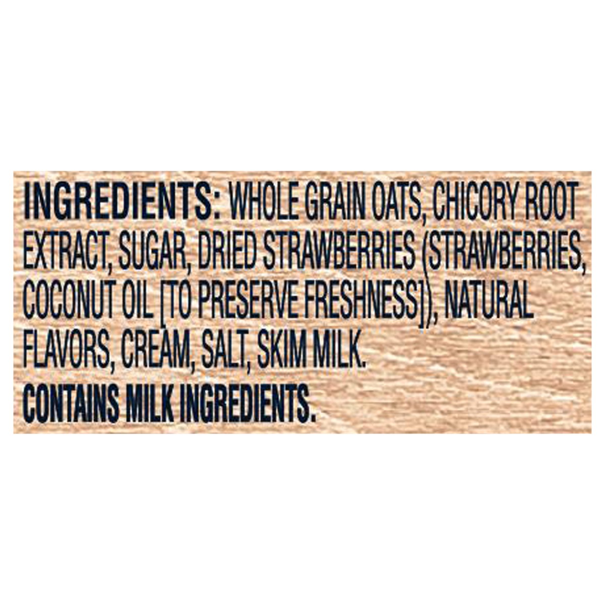 Whole Grain Oats, Chicory Root Extract, Sugar, Dried Strawberries (Strawberries, Coconut Oil [to Preserve Freshness]), Natural Flavors, Cream, Salt, Skim Milk.
