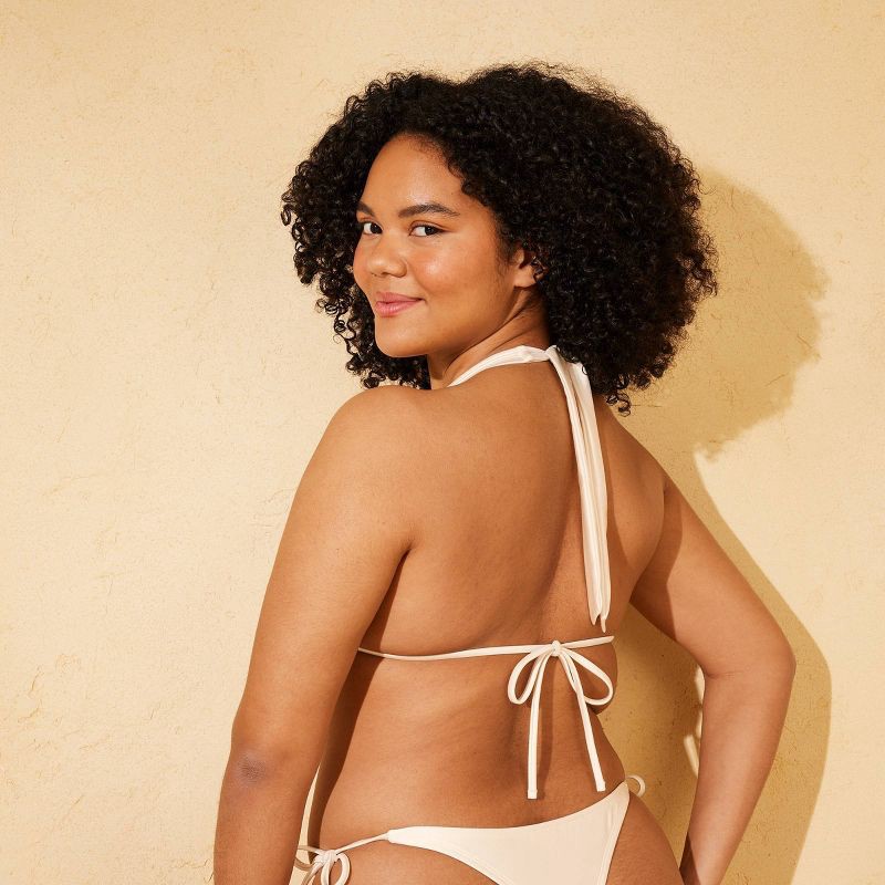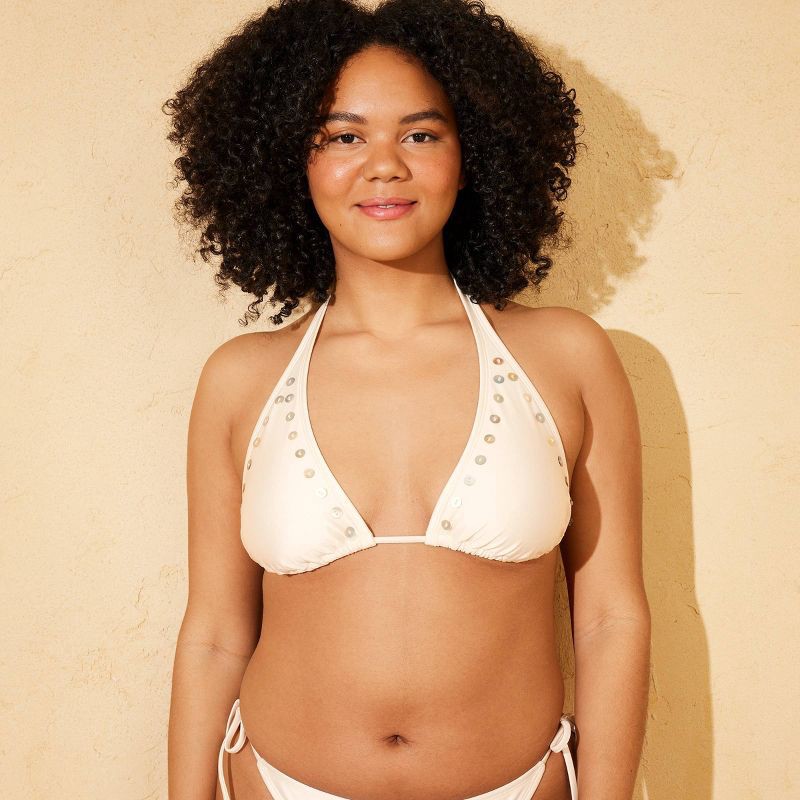 Triangle bikini top from Wild Fable™ in a cream color with a high-shine finish and shell button trimming. Features a wireless design with a halter neckline and medium coverage. Made from nylon tricot …