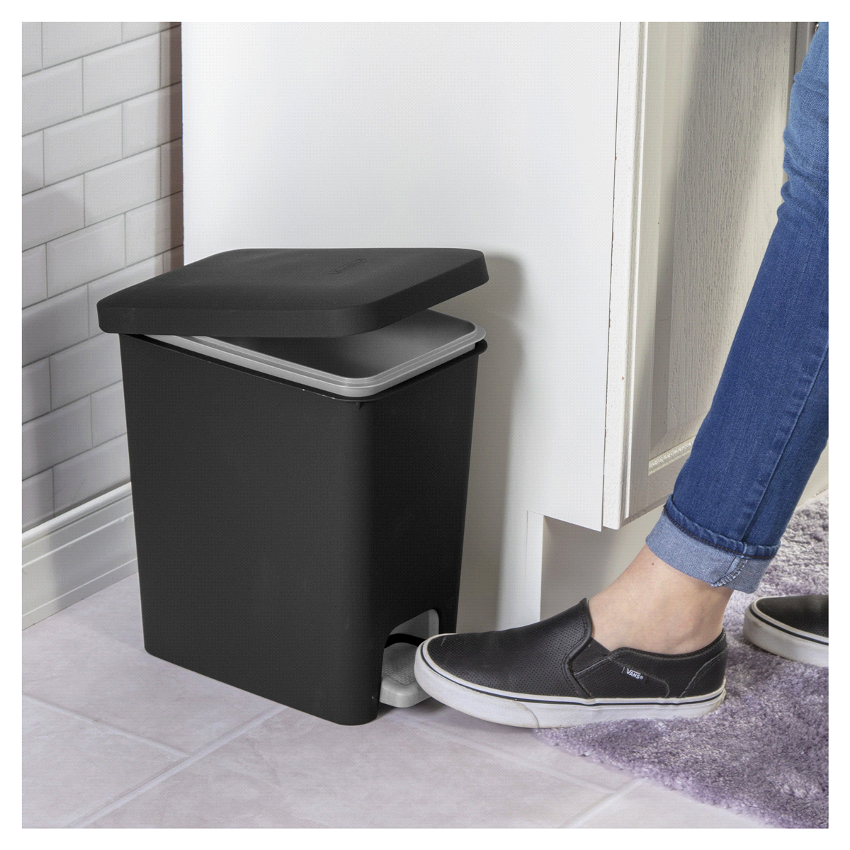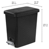 Sterilites 2.7 Gallon 10.2 Liter Rectangular StepOn Wastebasket features a color accented pedal, that when lightly pushed by a foot, smoothly opens the lid. Nested inside of the base is a removable l…