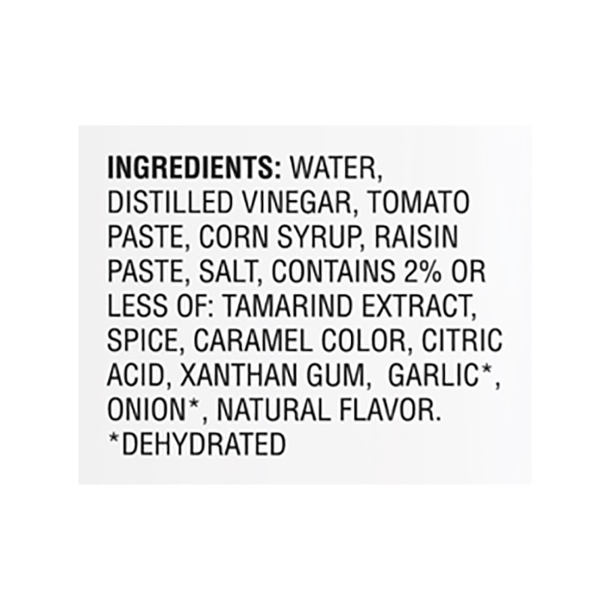 Water, Distilled Vinegar, Tomato Paste, Corn Syrup, Raisin Paste, Salt, Contains or Less of: Tamarind Extract, Spice, Caramel Color, Citric Acid, Xanthan Gum, Garlic*, Onion*, Natural Flavor, * Dehydr…