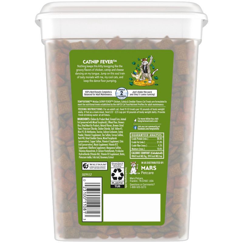 - 16 oz. Tub: Contains one (1) 16 oz. tub of Temptations MixUps Crunchy and Soft Cat Treats Catnip Fever - Chicken, Catnip, and Cheese Flavors.