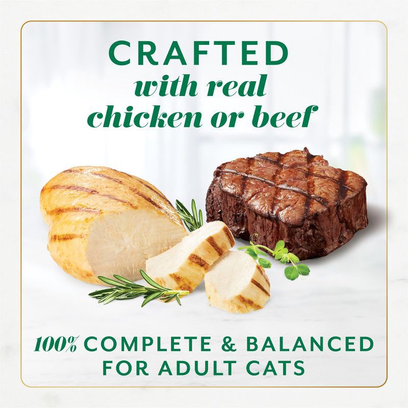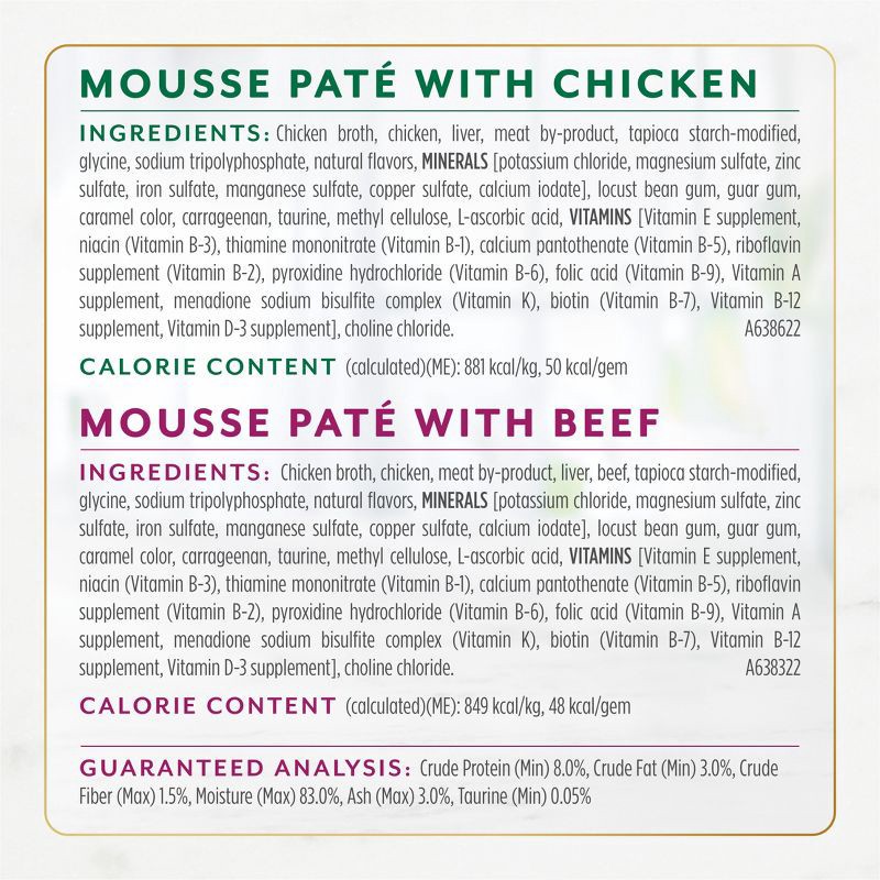 - Each delectable serving in this delicate mousse chicken and beef cat food wet pate variety pack is 100 percent complete and balanced for adult cats and comes in a cat-pleasing pyramid shape for easy eating